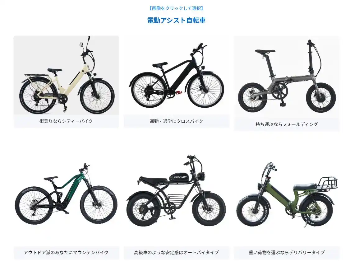 種別:シティーバイク、クロスバイク、マウンテンバイク、フォールディング(折りたたみ)、レトロオートバイタイプ等 |