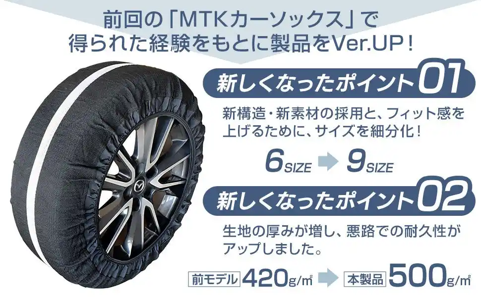 そんな悩みを解決するのが、次世代の布製タイヤチェーン「MTK Car Socks II(カーソックス2)」です。2018年の改正チェーン規制にも対応しており、欧州の厳しい標準規格にも準拠した信頼のアイテムです。 |