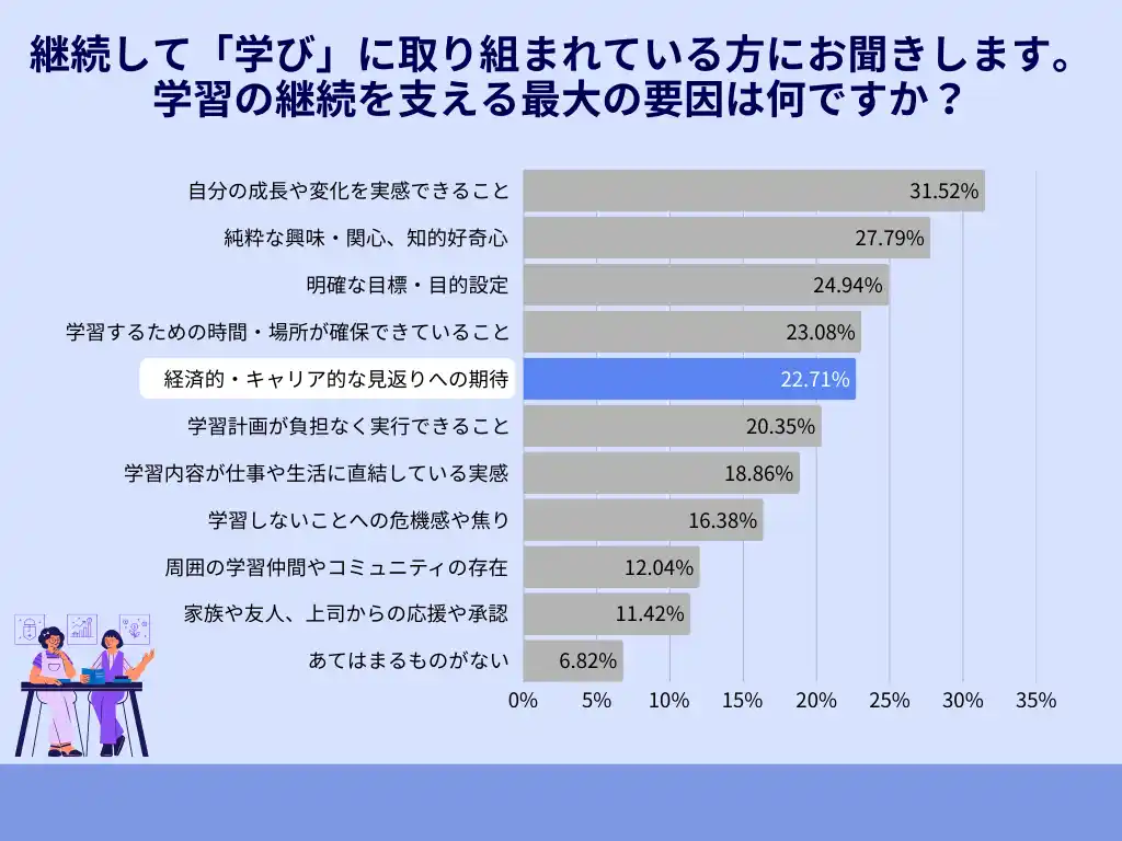 学びが継続できている要因として、「自身の成長や変化を実感できること(31.5%)」が最も多く、「経済的・キャリア的な見返りへの期待(22.7%)」は約5人に1人が意識していることが分かりました。将来の投資としての学びを継続させていることは、より良い条件で転職できる・年収が上がるという明確なリターンへの期待感が、忙しい日々の学習を支える要因になっていると考えられます。 |
