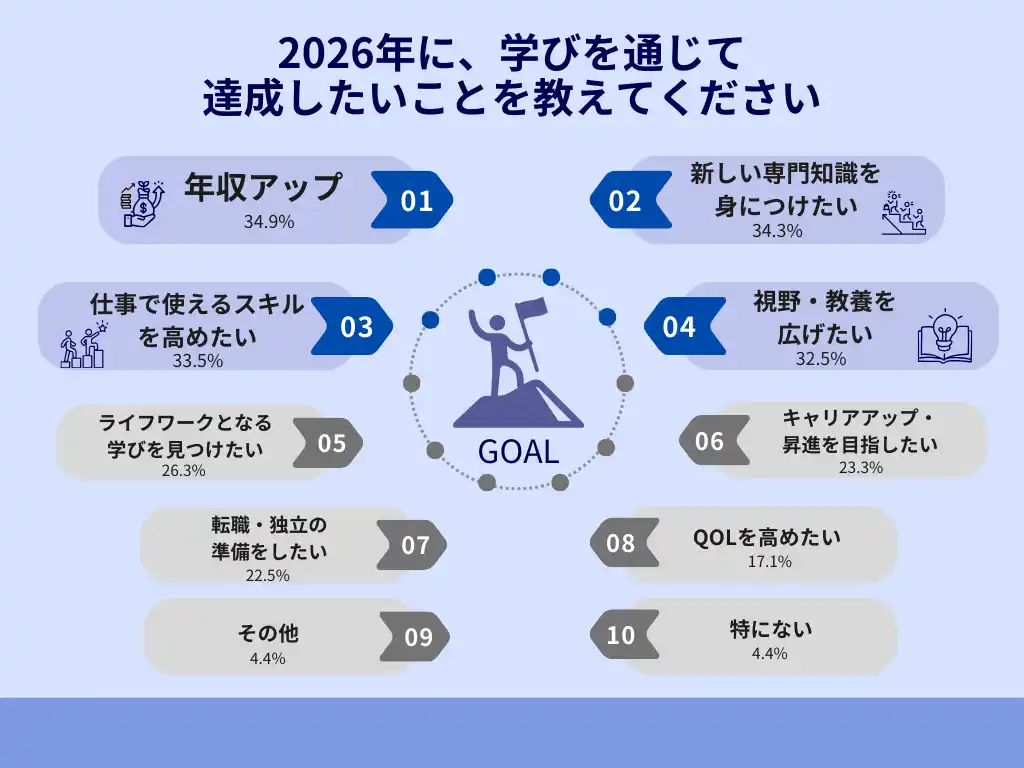 2026年に学びを通じて達成したいこととして、「年収アップ」が最も多く、 |