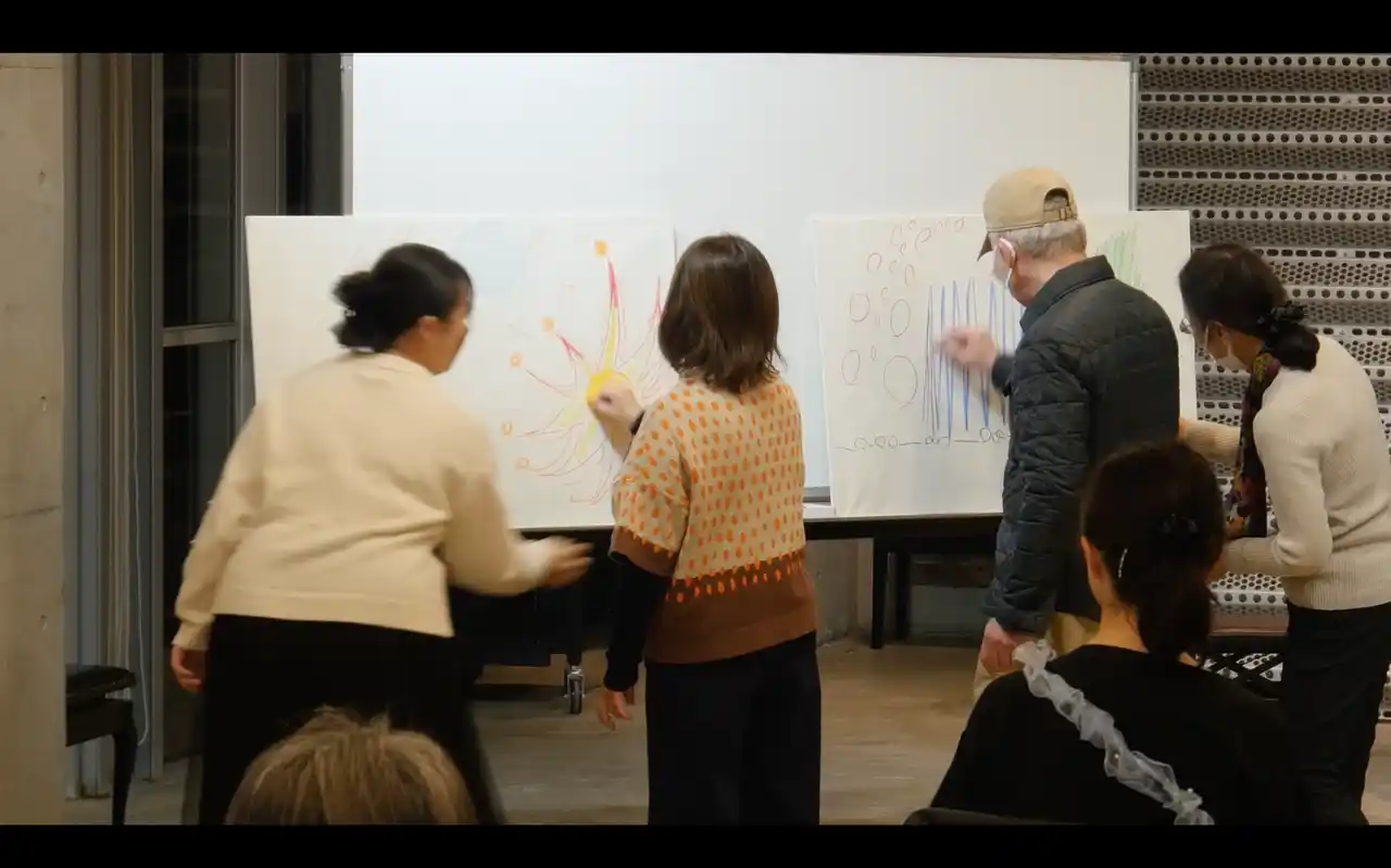 また、即興アートの時間では、壁一面に広がる色彩が「今ここにいる自分」を表現する手段となり、会場は楽しさあふれる笑顔と熱気に包まれました。 |