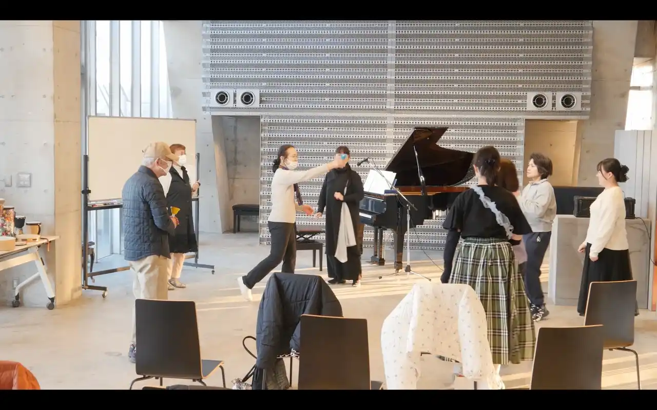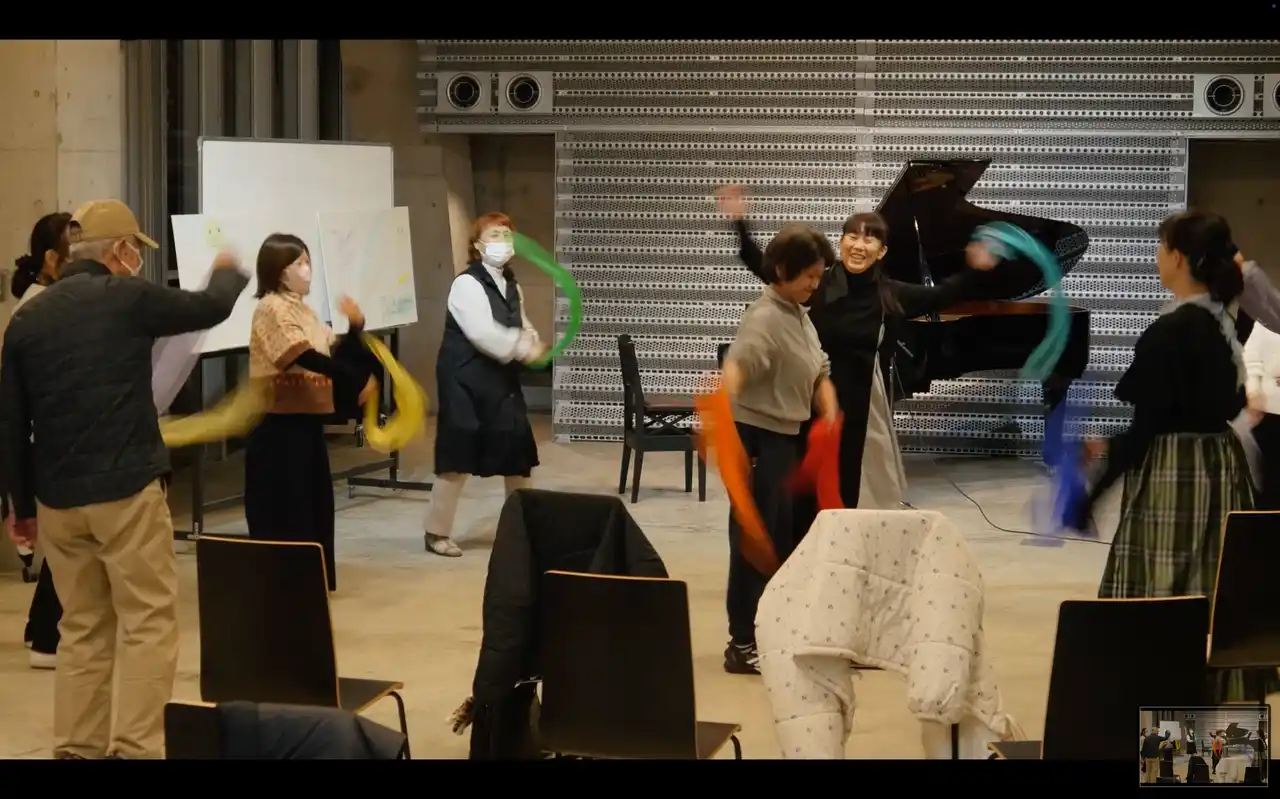特に印象的だったのは、音を使って感情を表現する「音とばし」や、参加者が色鮮やかなスカーフを手に輪になって動く場面です。 |