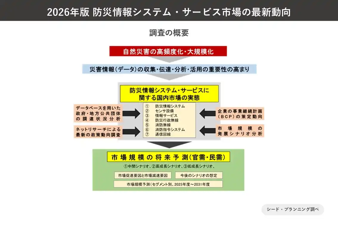 | また、近年では、防災情報システム・サービスとして、生成AI、各種IoTセンサ、ドローン・UAV、衛星リモートセンシング、被災者支援クラウド等の最新技術を積極的に活用する動きがあり、様々な商品が企業から提案されるようになっています。同時に、国や地方公共団体では、デジタル技術を活用した防災DX(デジタルトランスフォーメーション)に関連した調達を積極化させており、今後、デジタル技術やデータを重視する防災・減災・国土強靱化が進展することで、官公庁の調達が様変わりする可能性があります。 | ||||||