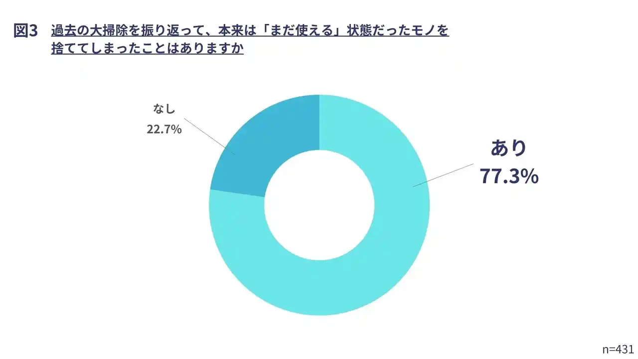 手間に加え、心の負担も大掃除の進行を妨げています。実際に、「過去の大掃除を振り返って、本来は『まだ使える』状態だったモノを捨ててしまったことはありますか」と聞いたところ、77.3%が「あり」と回答しました。 |
