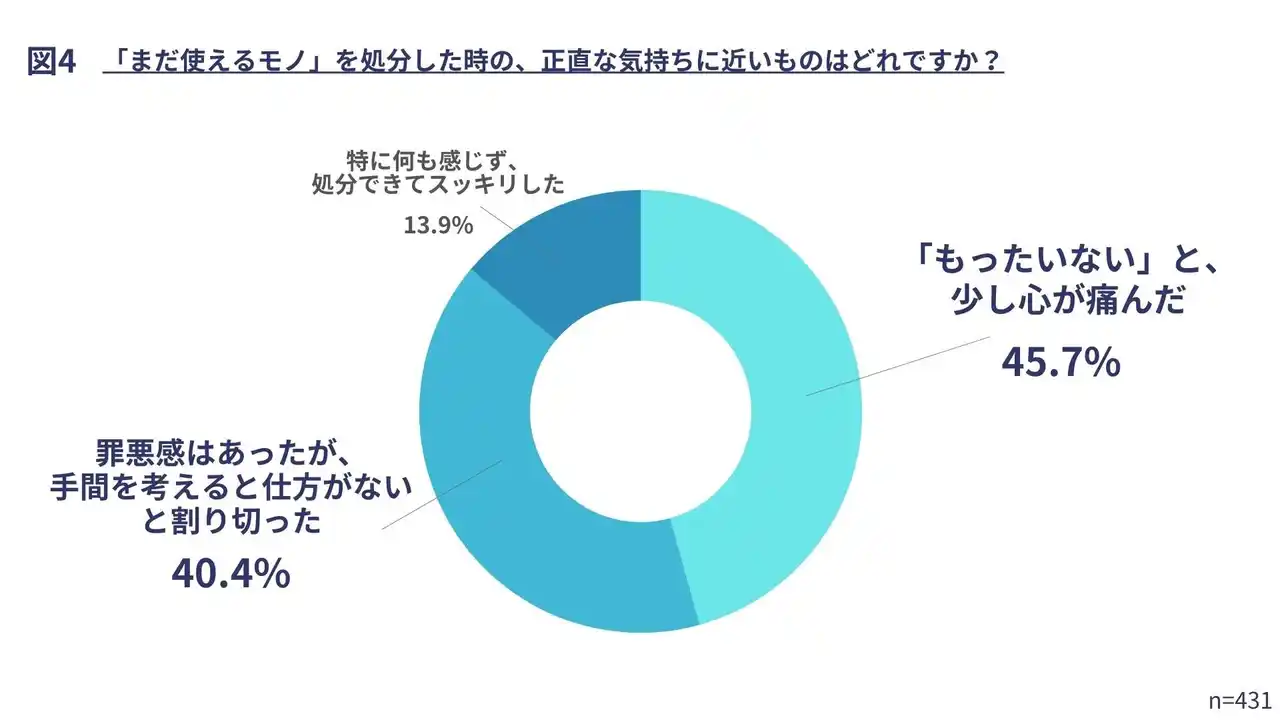 これらを合わせると、86.1%が処分に際して心の痛みを感じていることが分かります。 こうした「まだ使えるのに」という精神的な葛藤が「罪悪感」となり、手間に加えて手放しを躊躇させる要因となっていることが考えられます。 |
