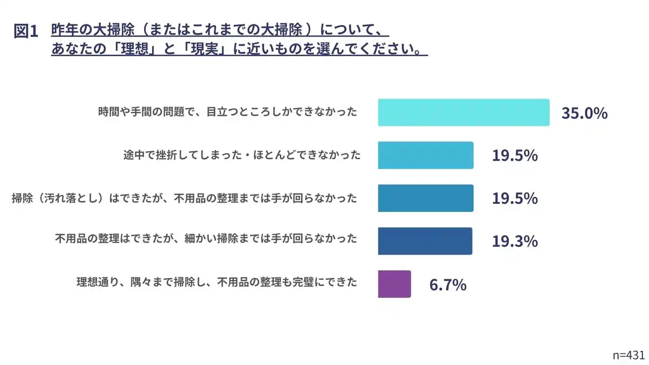 「理想通り、隅々まで掃除し、不用品の整理も完璧にできた」人はわずか6.7%。残り93.3%は理想の状態まで完了できていないと回答しました。 |