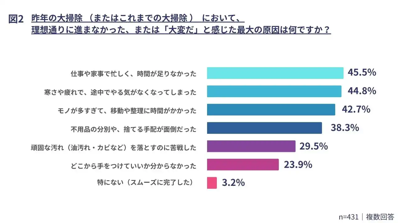 一方で、「モノが多すぎて、移動や整理に時間がかかった」(42.7%)も僅差で続いており、時間や体力の制約に加え、膨大なモノと向き合う作業の手間が大掃除の進行を妨げる要因となっていることがうかがえます。 |
