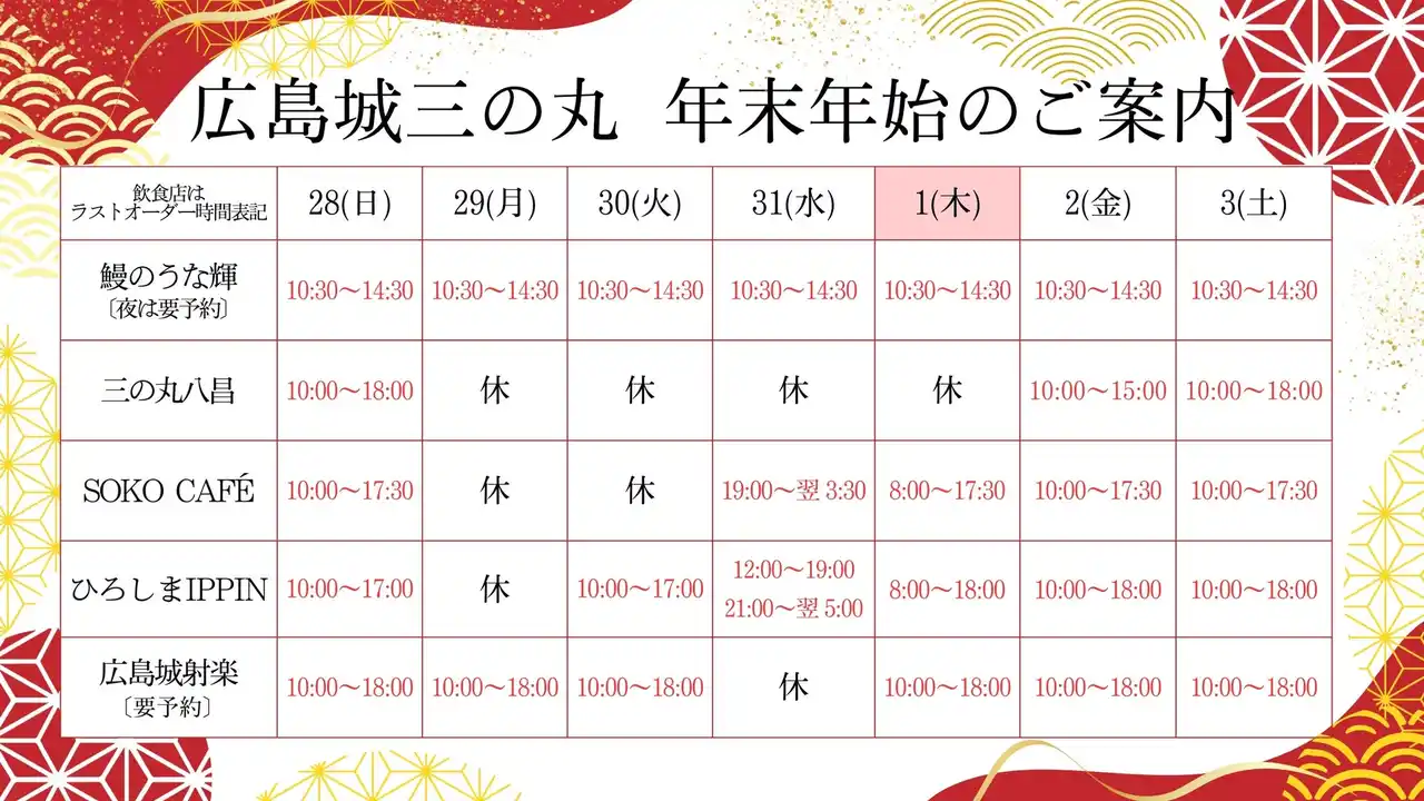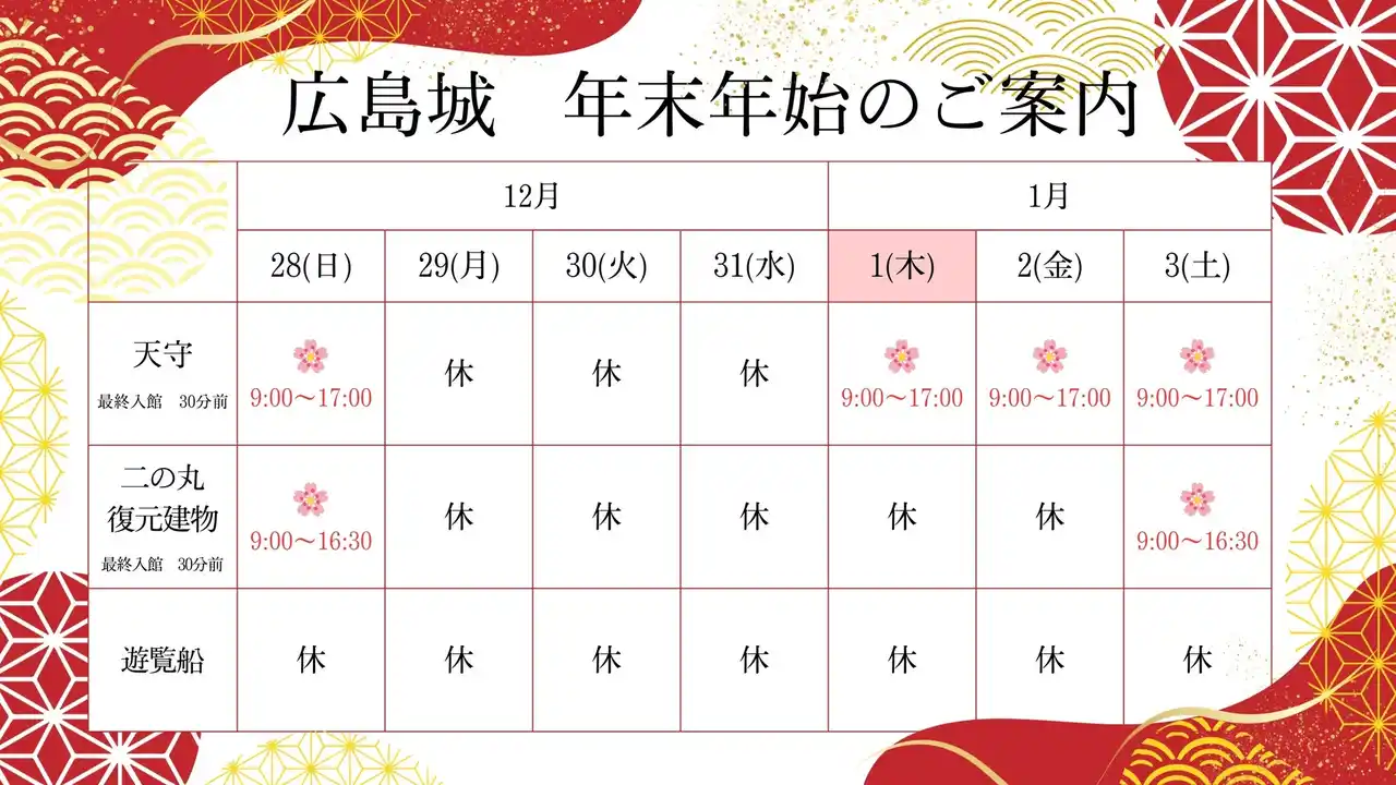 | 広島城天守・二の丸・遊覧船 年末年始情報 | |||