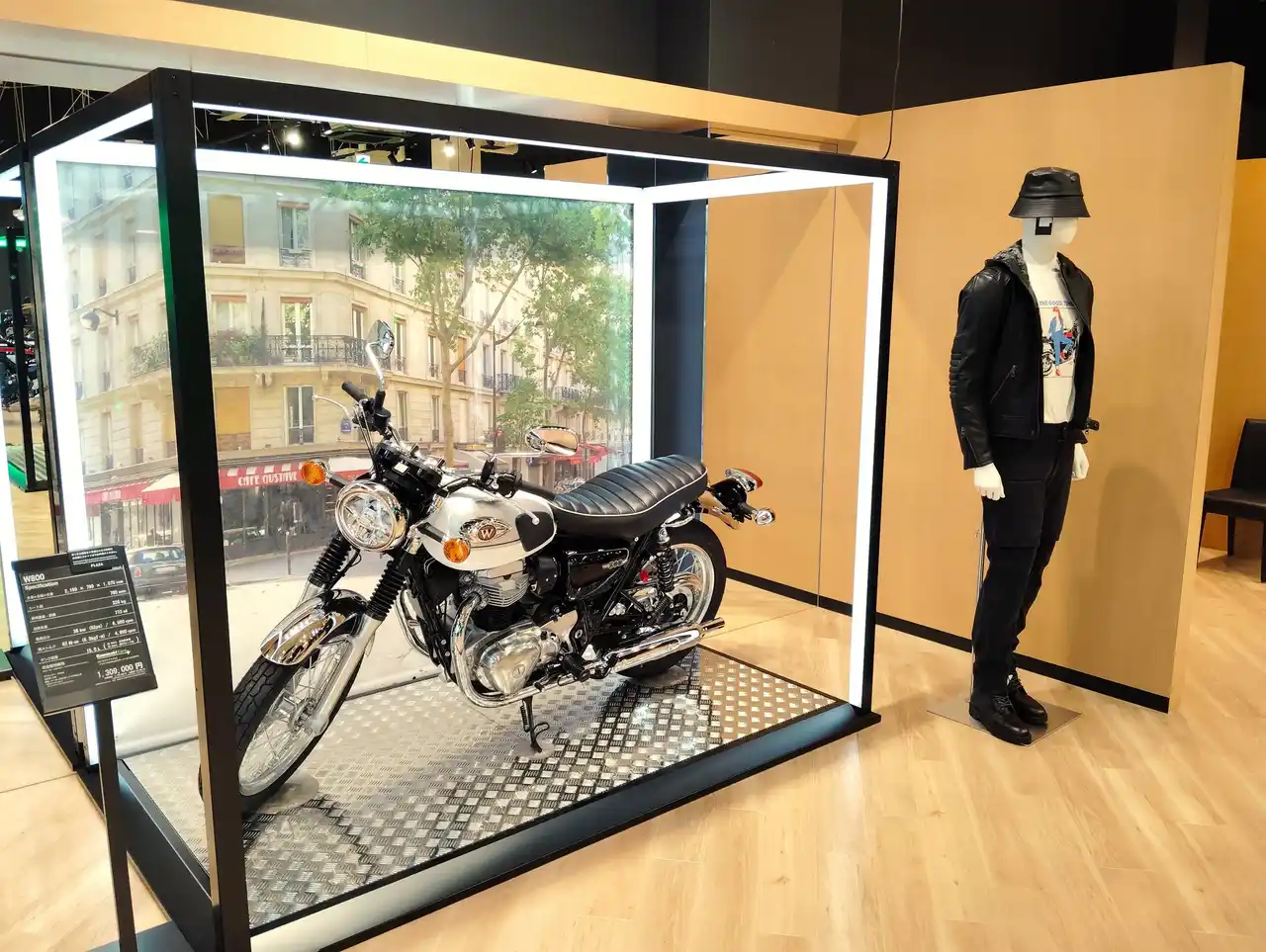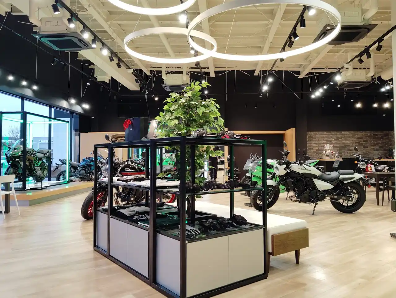 木目調のフロアと白い天井が織りなす明るい店内。モーターサイクルとプラザアパレルがゆったりと展示され、どなたでも楽しめる空間となっています。 |