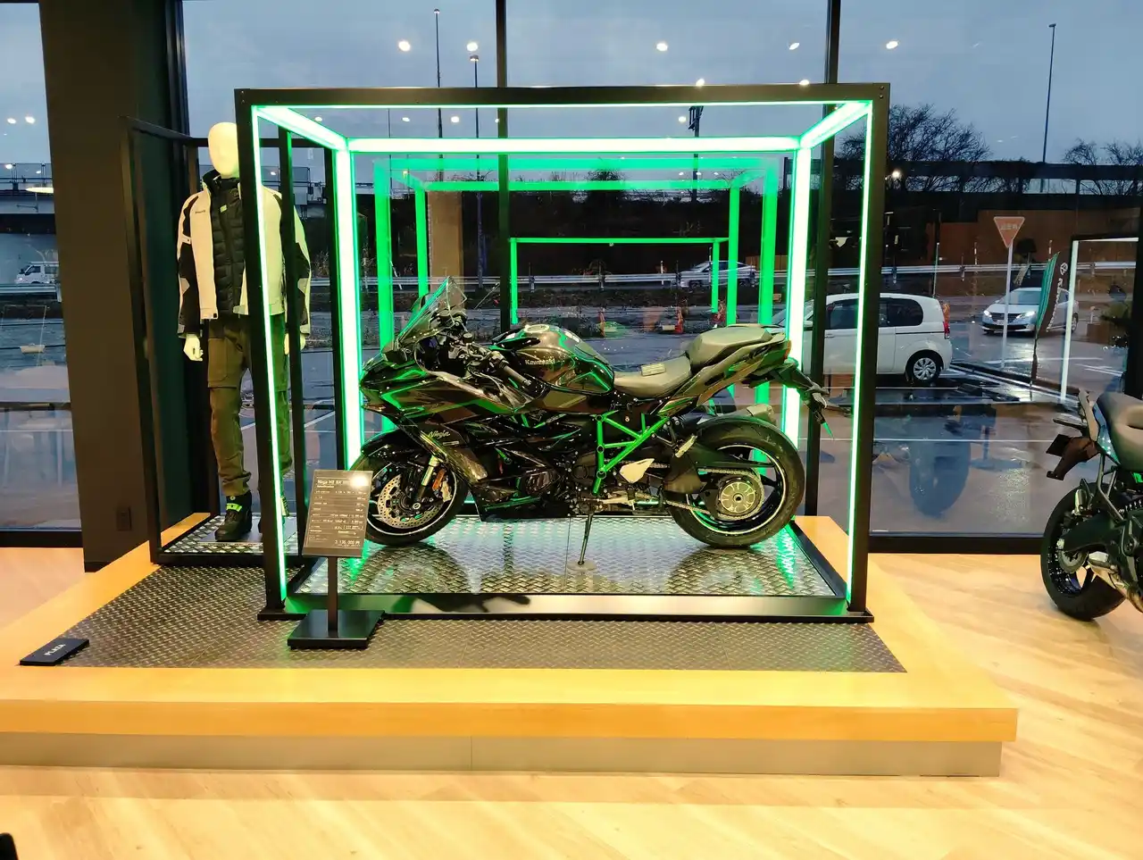 新たなオーナーを待つモーターサイクルたちが、ケージの中で静かに眠りについているイメージを光の枠で創出。カワサキプラザならではのアイコニックポイントの一つです。 |