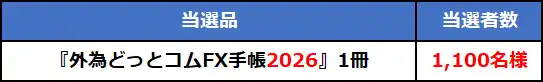 対象期間中にエントリーのうえ所定のクイズに正解され、かつ『外貨ネクストネオ』にて1回以上の新規取引をされた方の中から抽選で1,100名様に、『外為どっとコムFX手帳2026』1冊を進呈いたします。さらに、同期間中に『CFDネクスト』にて1回以上の新規取引をされると当選確率が3倍になります!! |