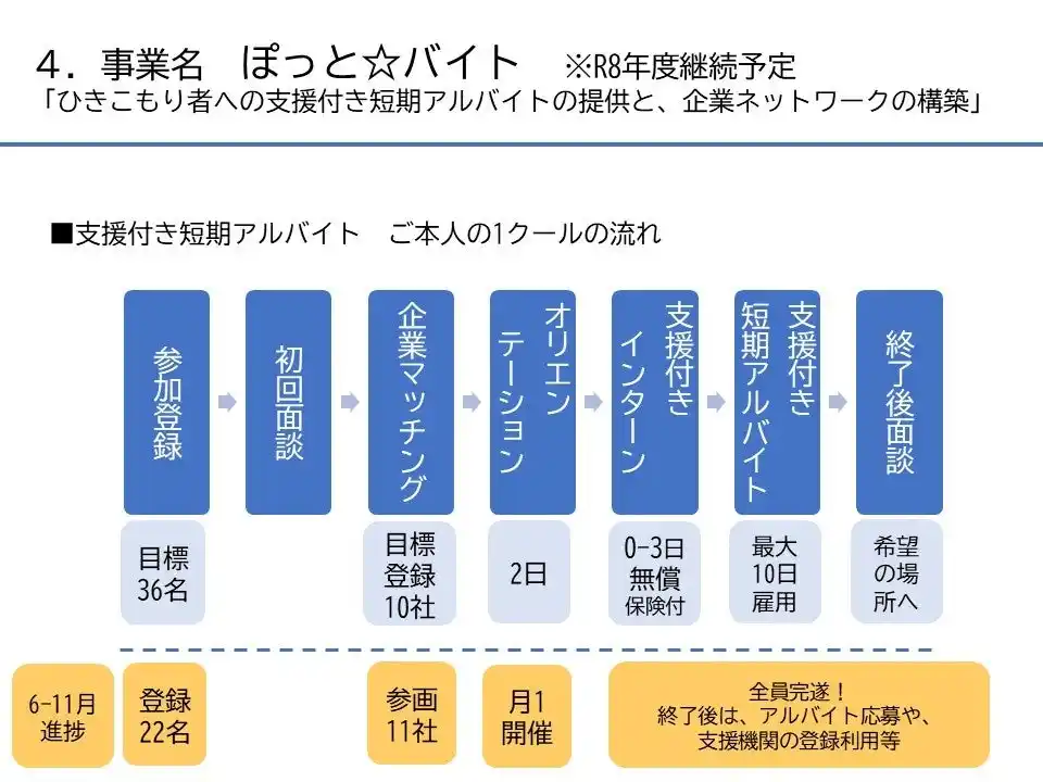 ぽっと☆バイト終了後6か月以内に7名の方が就職し、ひきこもり状態から抜け出しています。 |