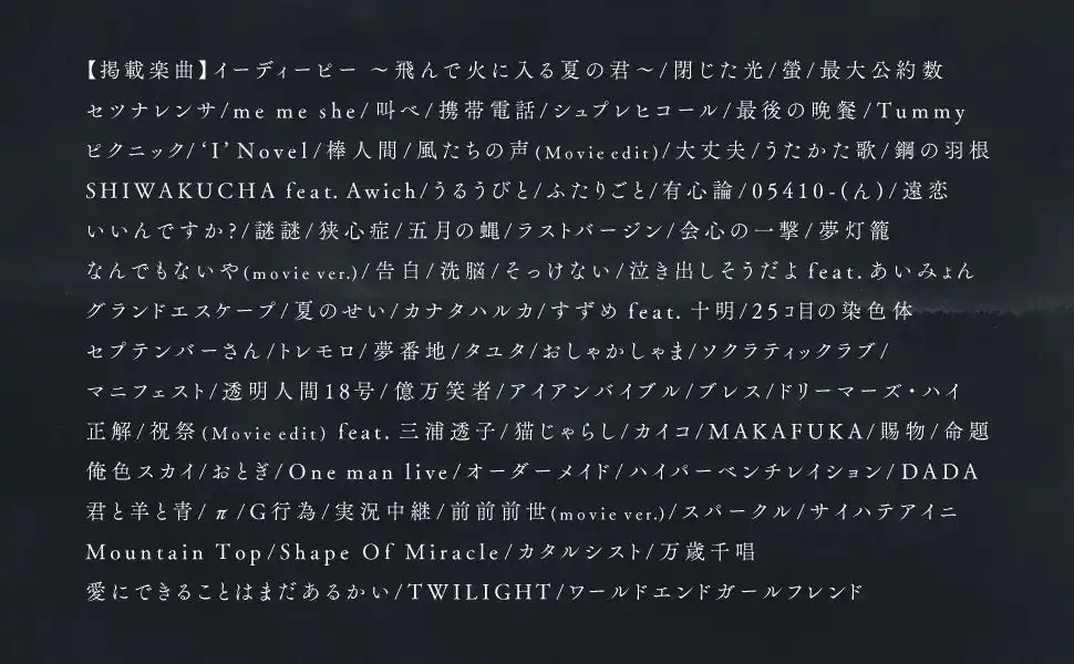 ジャンルという既存の枠組みに捉われない音楽性、恋愛から死生観までを哲学的に、情緒的に描いた歌詞で、思春期を過ごす世代を中心に幅広い層に大きな支持を受けている。 |