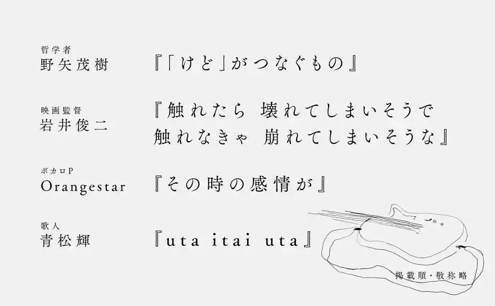 三浦しをん・安藤宏・生方美久・青木琴美・野矢茂樹・岩井俊二・Orangestar・青松輝による寄稿文のタイトルも掲載