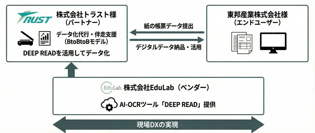 この課題に対し、パートナーであるトラスト様は、納品書明細入力「業務をAI-OCRでデジタル化すべき」と提案しておりました。しかし、東邦産業様に新たなツール導入後に発生する運用で過度な負担をかけないよう、トラスト様が「DEEP READ」を使ってデータ化処理を請け負う形式(BtoBtoBモデル)を採用しました。 |