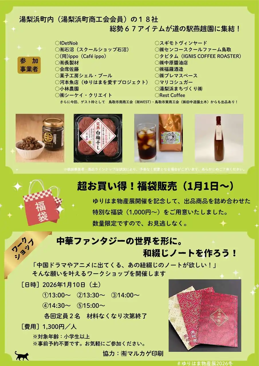 地元商品をより多くの方に知ってもらいたいと昨年より湯梨浜町商工会と道の駅燕趙園がタッグを組んで物産展を開催しています。3回目となる今回は「ゆりはま物産展」と名称を変更し、参加事業所は今までで最大の地元の18社+ゲスト2社(町外)による、こだわりの67アイテムが集結 |