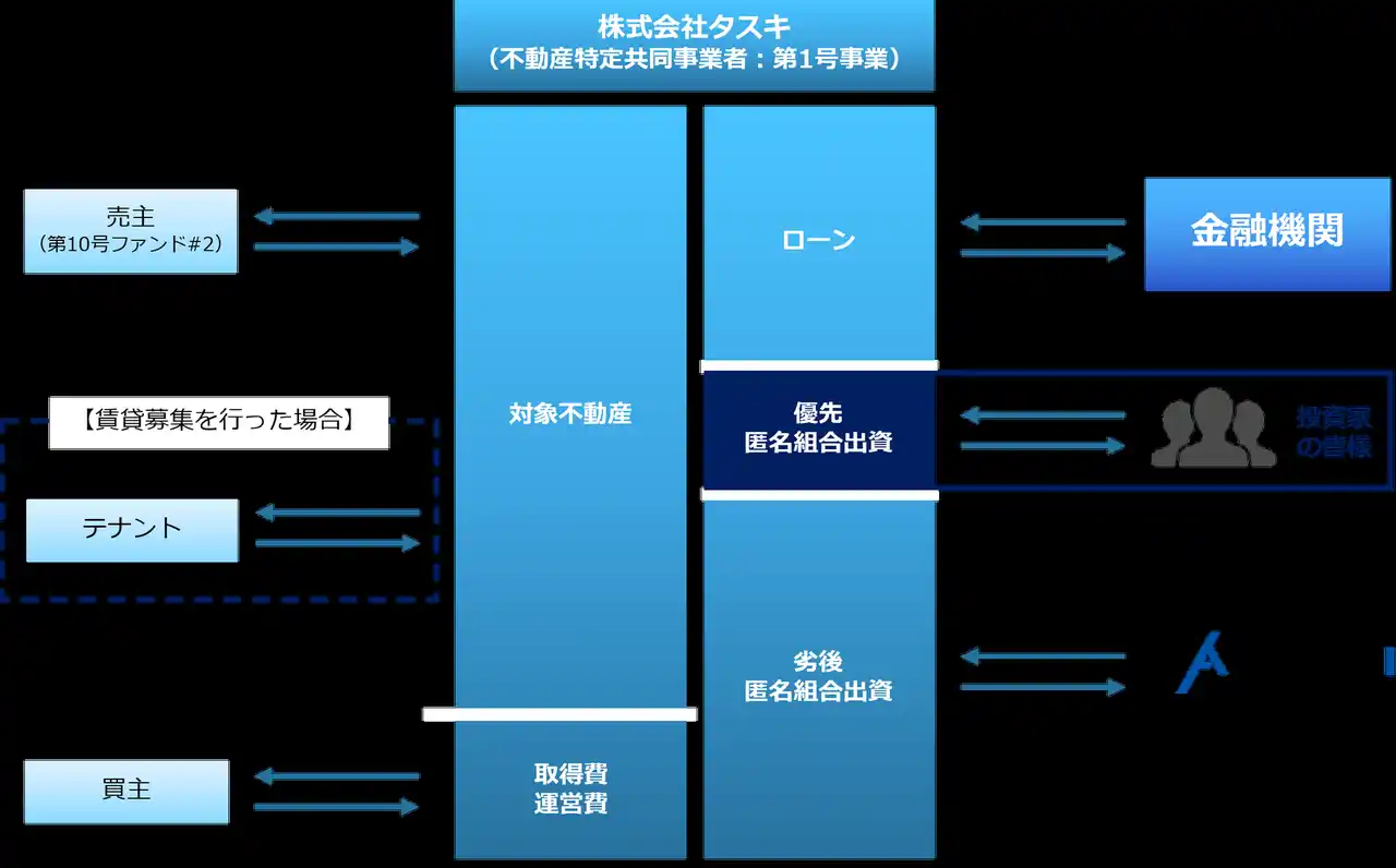 本ファンドは優先劣後方式により、投資家の皆様へは優先出資分として800口を募集します。一方、タスキは2,400口を劣後出資いたします。万一、損失が発生した場合、タスキが先に損失部分を負担しますので、投資家の皆様は、タスキより優先して出資金の返還を受けることができます。 |