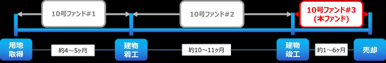 本ファンドは、用地の取得から建築確認済証の取得・着工までを運用期間とした「タスキ キャピタル重視型 第10号ファンド#1」および着工から竣工までを運用期間としている「タスキ キャピタル重視型 第10号ファンド#2」に続くフェーズとして、竣工から売却までを運用期間とする「タスキ キャピタル重視型 第10号ファンド#3」を組成するものです。同一物件に対し、プロジェクトの進行度合いによる事業リスクの程度に応じて段階的にクラウドファンディングを組成し、投資家のみなさまの新たな投資機会の創出と、資金流動性の向上を図ります。 |