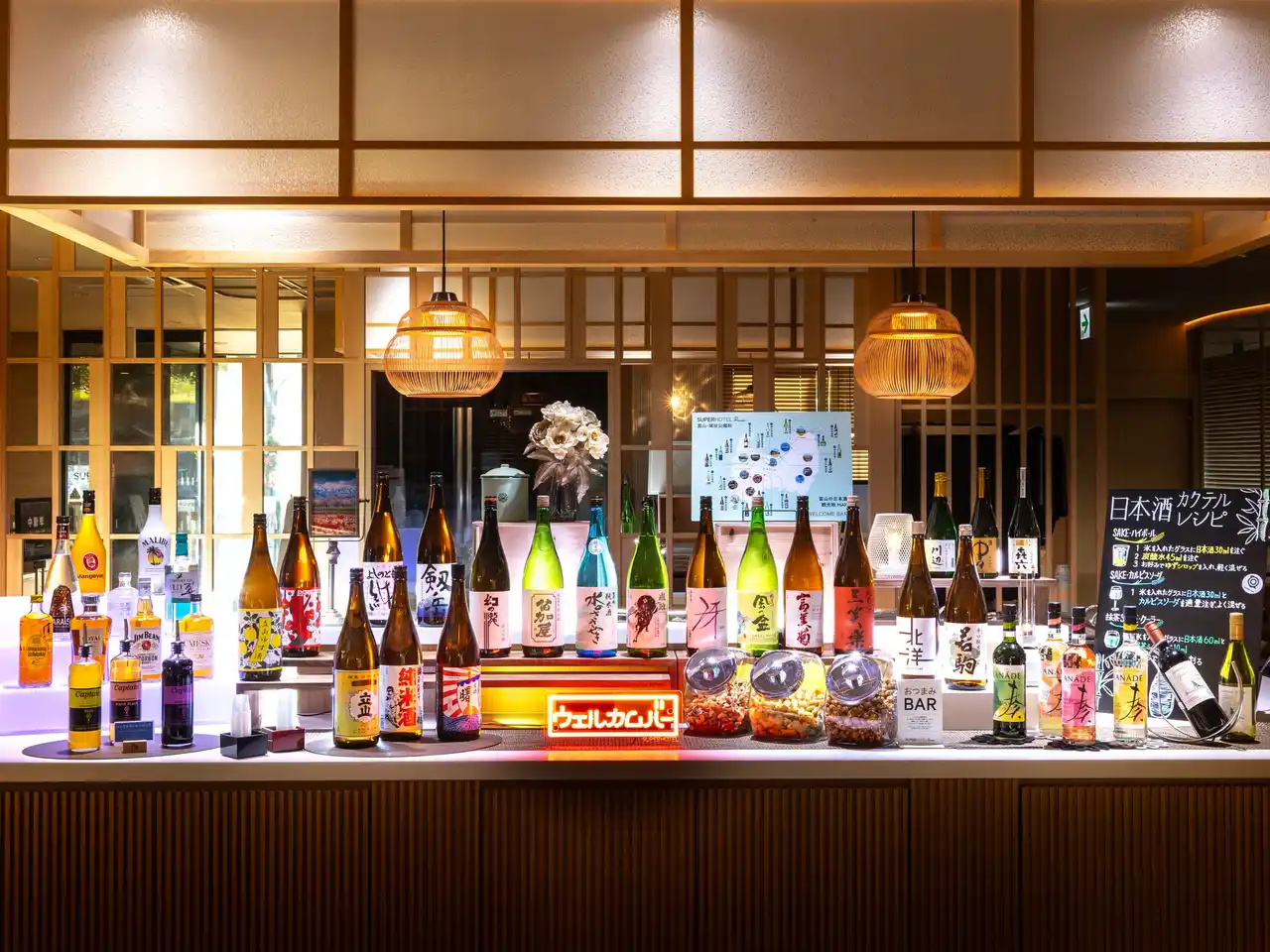 「スーパーホテルPremier富山・城址公園前」のウェルカムバーでは、アルコール飲料としては富山の日本酒を中心に、地元の日本酒で作った梅酒、ゆず酒など幅広いラインナップを提供しています。 |