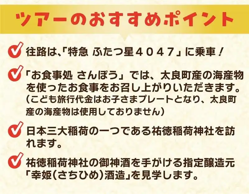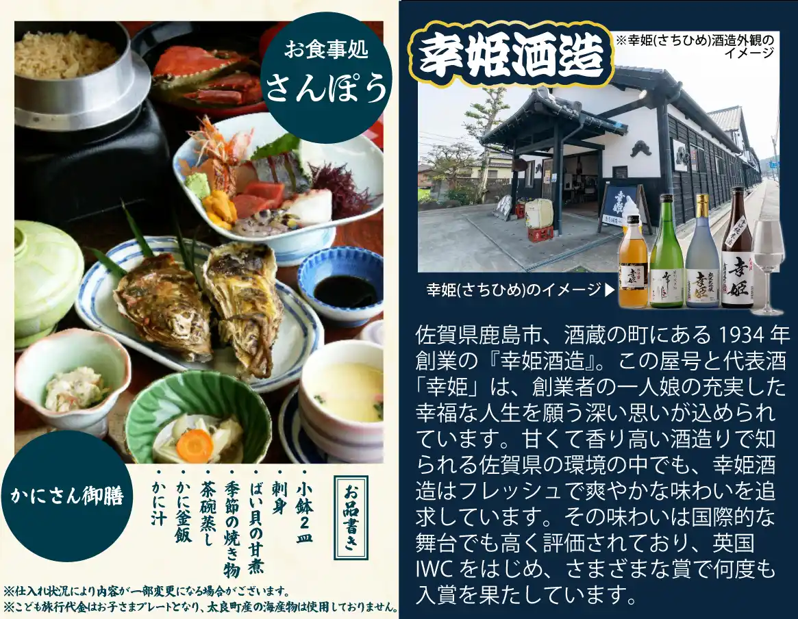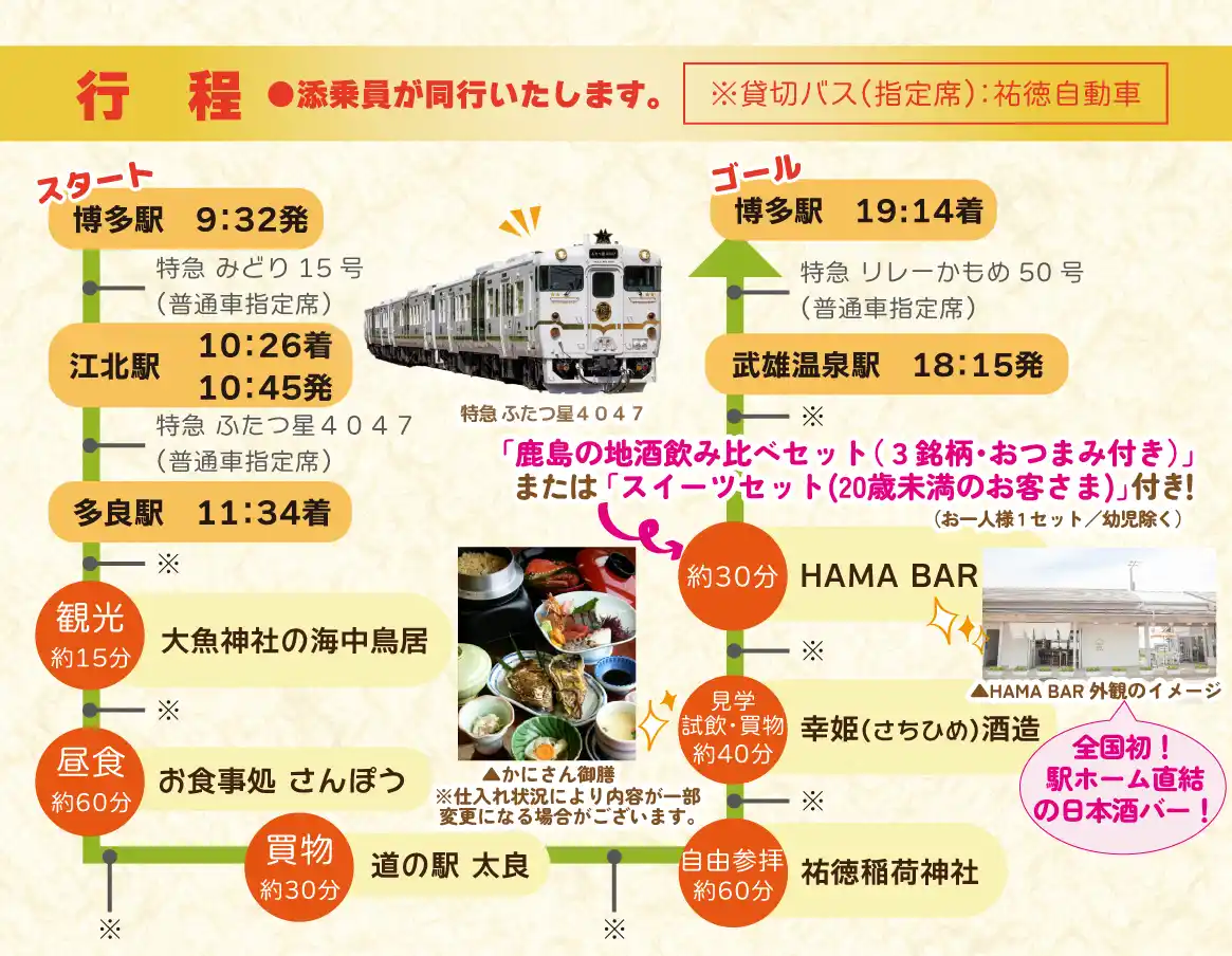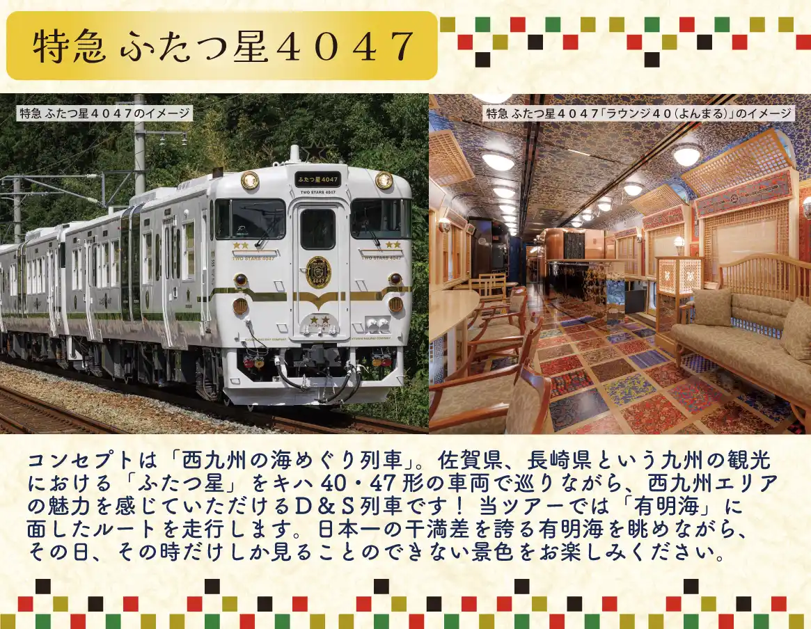 | (1) ツアー名称:「特急 ふたつ星4047」で行く!「太良の味覚」と「鹿島の日本酒」満喫たび | |||||||||