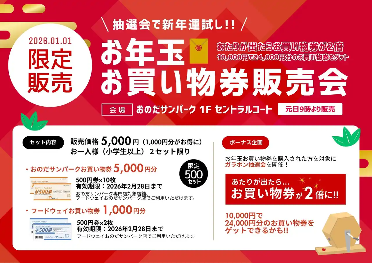 【販 売 価 格】1セット5,000円(1,000円分お得) 【セット内容】サンパークお買い物券5,000円分+フードウェイお買い物券1,000円分(いずれも有効期限2026年2月28日) 【購 入 制 限】おひとり様(小学生以上)2セット お買物券ご購入後、会場で実施する抽選会で当選された方には、ご購入分と同額セットをプレゼントいたします。 |