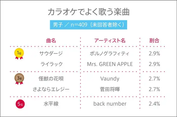 男子の同率1位は、Mrs. GREEN APPLE『ライラック』でした。 |