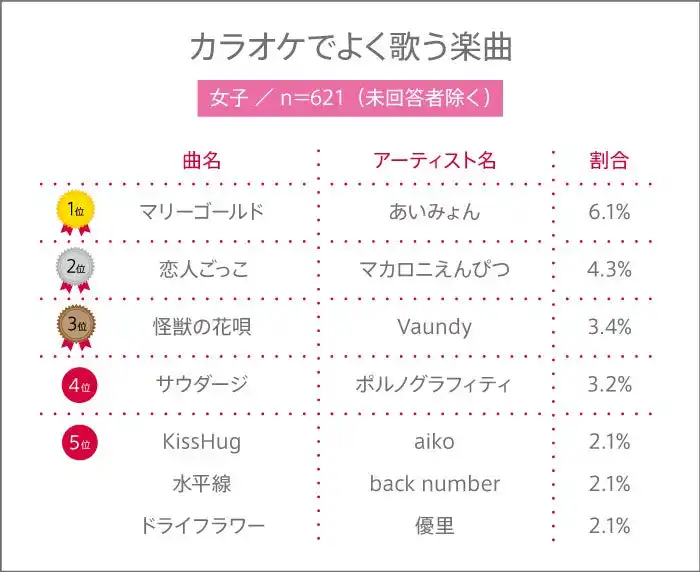 男子でランクインした楽曲のほとんどが同性である男性アーティストのものでしたが、女子ではマカロニえんぴつやポルノグラフィティなど、異性である男性アーティストの楽曲も多くランクインしました。 |