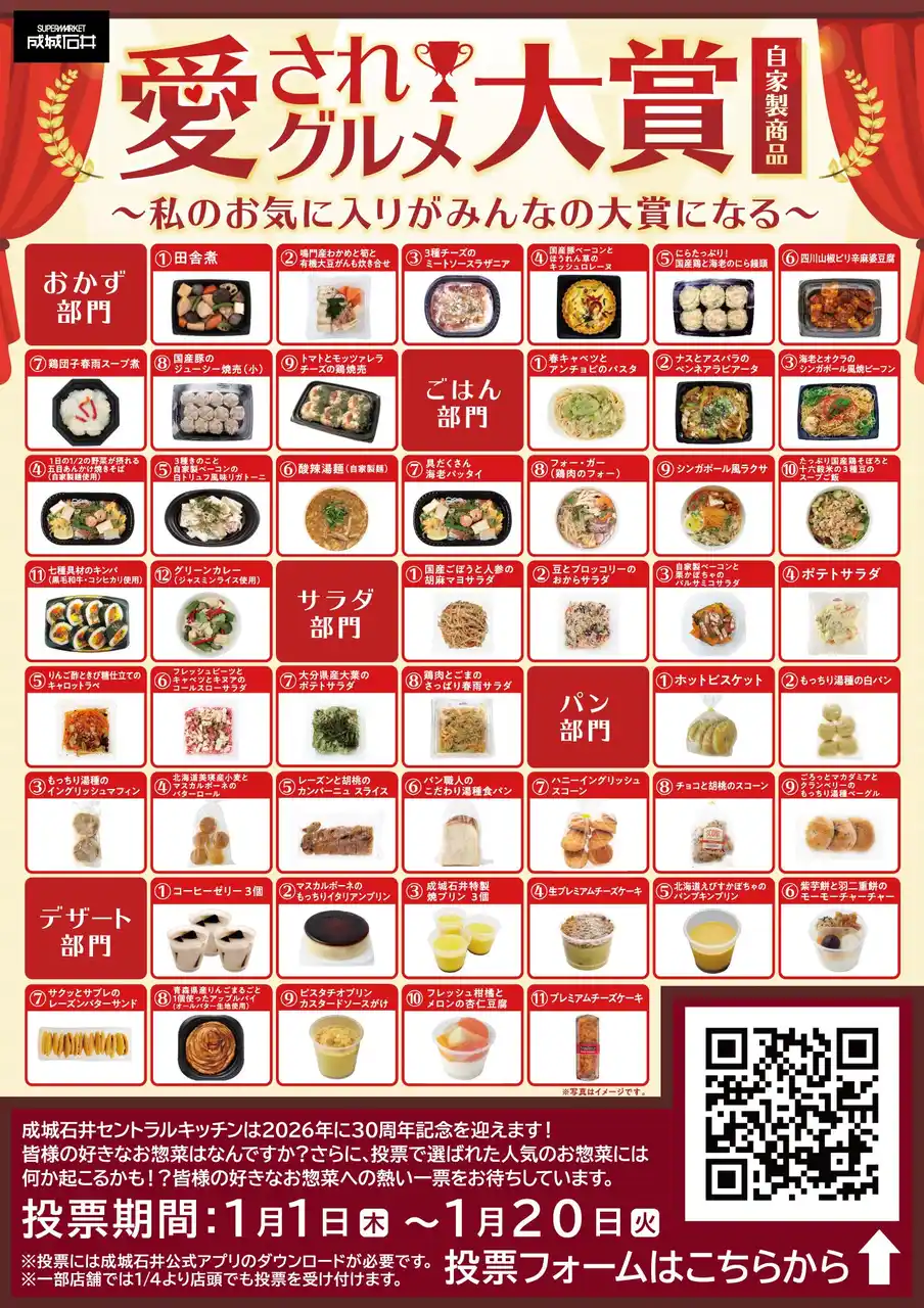 | 株式会社成城石井(本社事務所:神奈川県横浜市西区みなとみらい、代表取締役社長:後藤勝基)は、「成城石井“愛されグルメ”大賞」を決めるお客様投票を、2026年1月1日(木・祝)から1月20日(火)まで、成城石井公式アプリと一部店舗にて実施いたします。 | ||||||||||||||