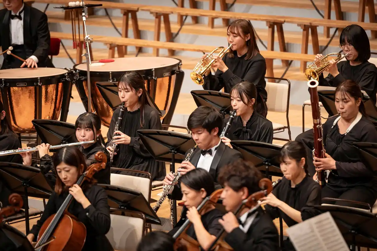 指揮を手がけるのは、国内外の多くのオーケストラと共演し世界的に活躍する演奏学科教授の大友 直人氏。学生たちの力を最大限に引き出し、音楽解釈や表現を深めながらも、学生が自ら気づき、考え、表現する姿勢を育む指導を行っています。集中練習や当日の最終リハーサルを経て迎えた本番。会場は期待に満ちた観客でほぼ満席となり、熱気に包まれました。 |