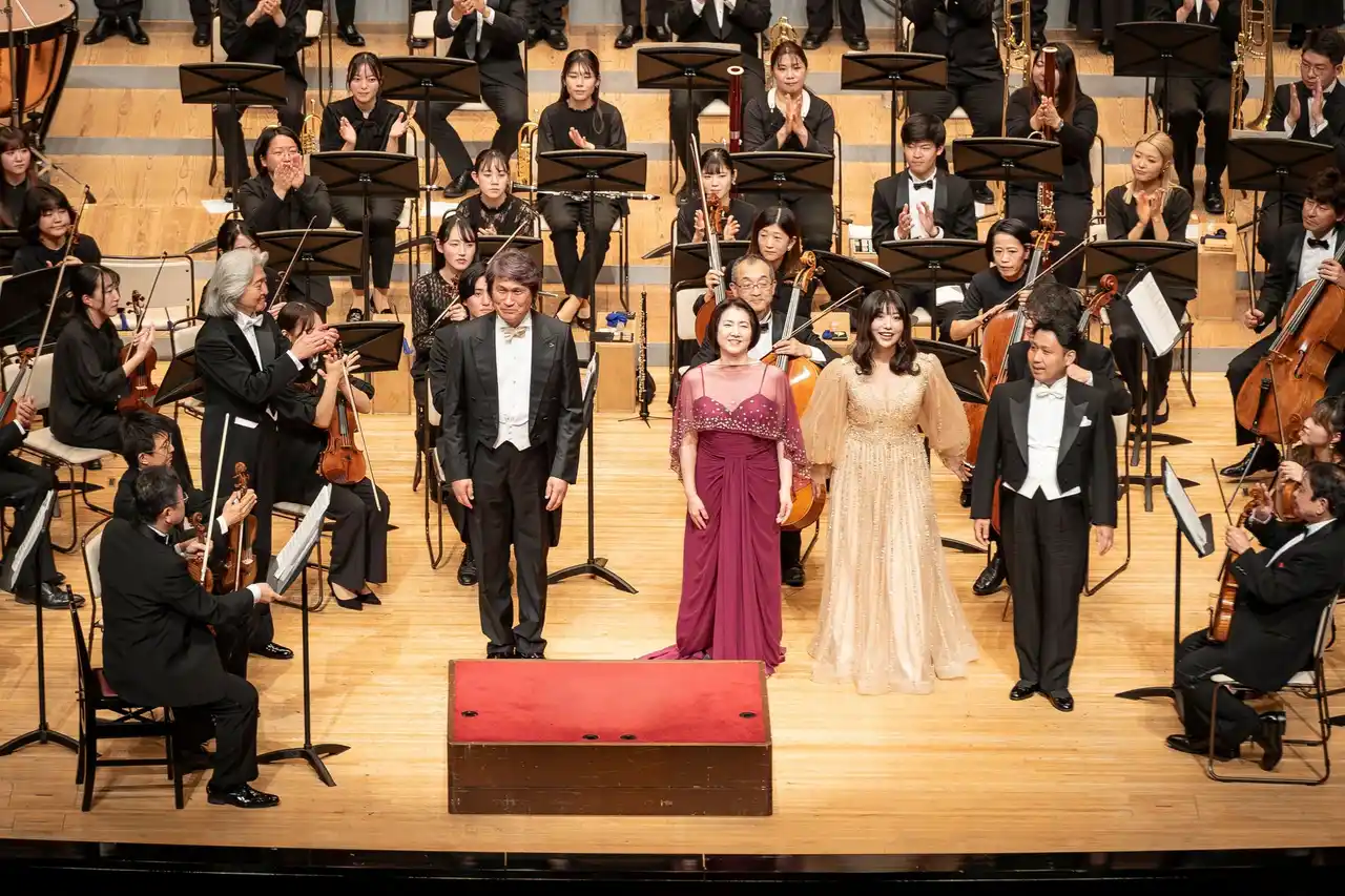 大阪芸術大学(所在地:大阪府南河内郡、学長:塚本 邦彦)は、2025年12月4日(木)に、大阪・中之島のフェスティバルホールにて、「大阪芸術大学 特別演奏会 2025 ~あなたに贈る特別なコンサート~」を開催いたしました。毎年12月に行われるこの演奏会は、演奏学科の学生たちがプロの音楽家と同じ舞台に立ち、一年間の研鑽の成果を披露するクラシック音楽の学びの集大成です。今年は、国内外で活躍する本学演奏学科教授・大友 直人氏の指揮のもと、ベートーヴェンの「『エグモント』序曲作品84」、そして4年に一度の伝統であり、年末の風物詩としても名高い「交響曲第9番 ニ短調 作品125『合唱付き』」(通称:第九)の2曲が披露され、会場全体が大きな感動と熱気に包まれました。 |