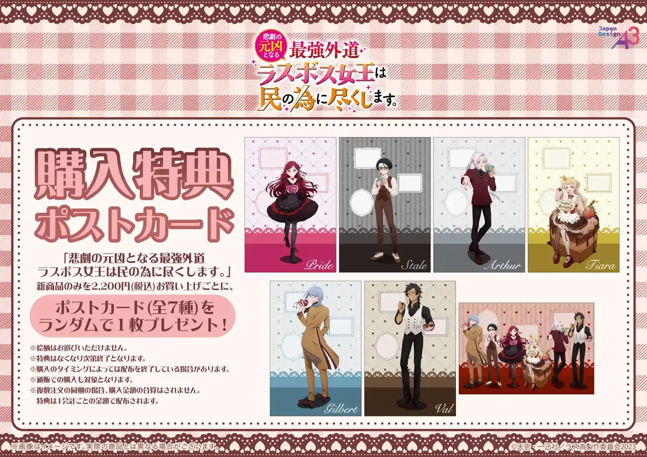 | TVアニメ『悲劇の元凶となる最強外道ラスボス女王は民の為に尽くします。』の新商品のみを1会計2,200円(税込)以上お買い上げごとに、購入特典としてポストカード(全6種)を1枚プレゼントします。 | |||||||||