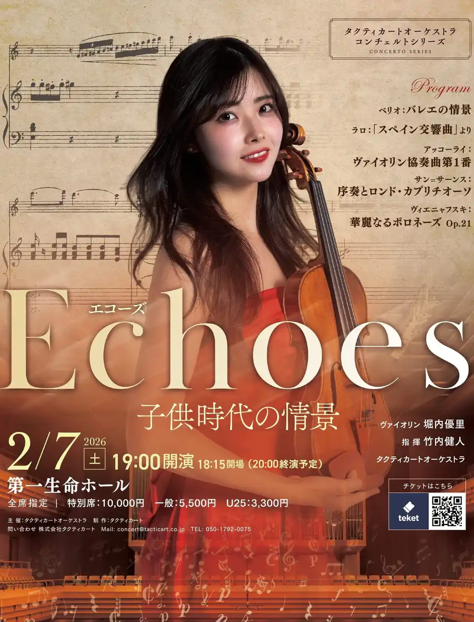 | 2026年2月7日(土)、ヴァイオリニスト・堀内優里とタクティカートオーケストラによる、『堀内優里 Echoes ― 子供時代の情景 ―』が開催される。 | |||