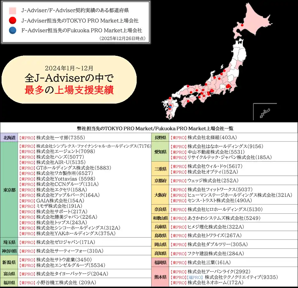 また、2024年12月には、福岡証券取引所が運営するプロ投資家向け市場、Fukuoka PRO Marketの上場指導・審査を行うF-Adviser資格も取得いたしました。 |