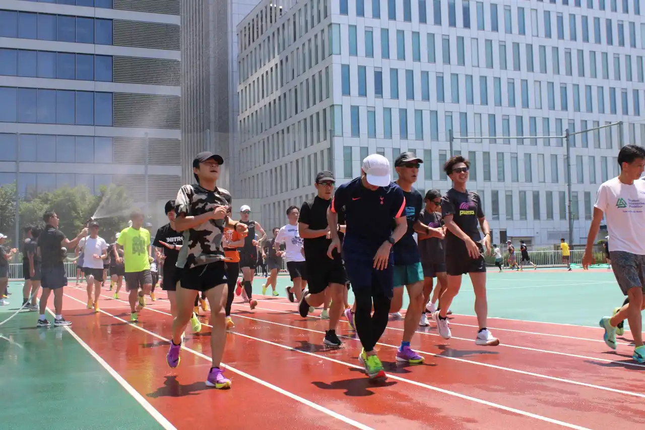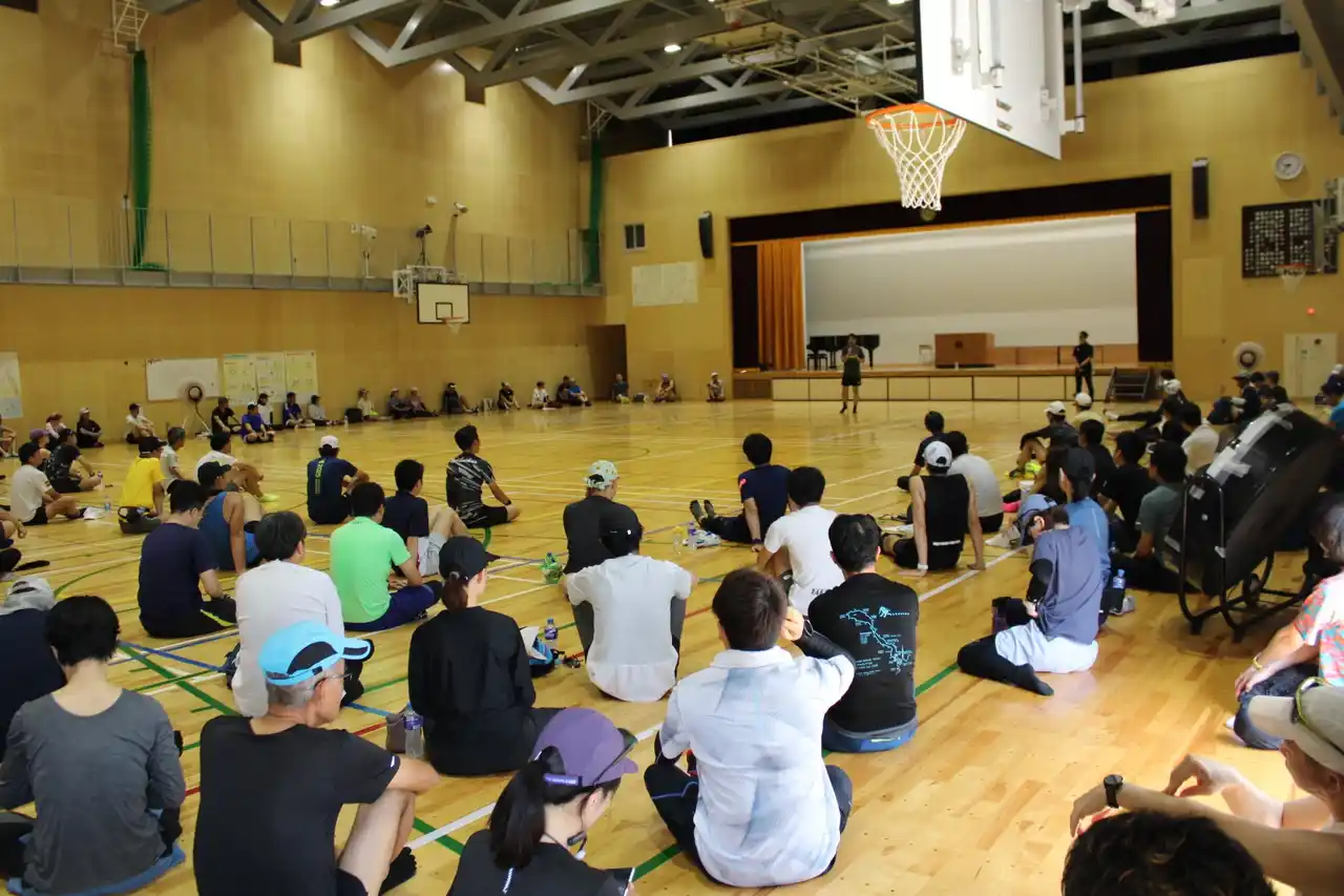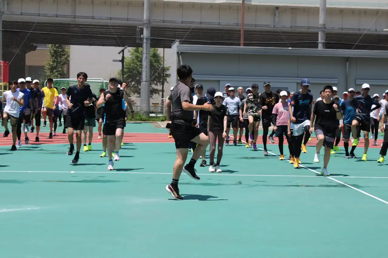 今回は、インターバルトレーニングで <速く走る>ことを脳と体で学習することによって、より速く走る・持続する・タイムを短縮することが狙いです。座学では、テーマにまつわる講義と共に、コーチが「速度や強度を落とさずに、休憩を取りながらがんばりましょう」と激励。「なかなかスピードが出ないときは、ペーサーや今日一緒にトレーニングをする仲間の力を借りましょう」とアドバイスを送りました。ウォーミングアップを行った後は、目標タイム別(サブ3.5、サブ4、サブ4.5、サブ5、完走)グループに分かれて、200m走を各グループ約10本、しっかりと休憩を取るなど、熱中対策をし、炎天下の中ながら、見事に走り切りました。 |