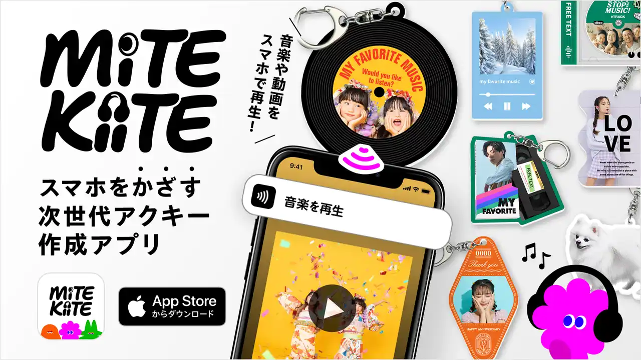 「MiTE KiiTE」はアプリ内でアクリルキーホルダーデザインを作成・注文し、手元に商品が届いてから読み取り機能(動画再生、音楽再生など)を登録する、というサービスです。“スマホをかざすと音楽や動画が再生できるアクリルキーホルダー”と言っても、初めて耳にする方にとっては使い方や利用シーンが想像しづらく、かねてより「実物を一般の方に体験いただける機会」を模索していました。 |