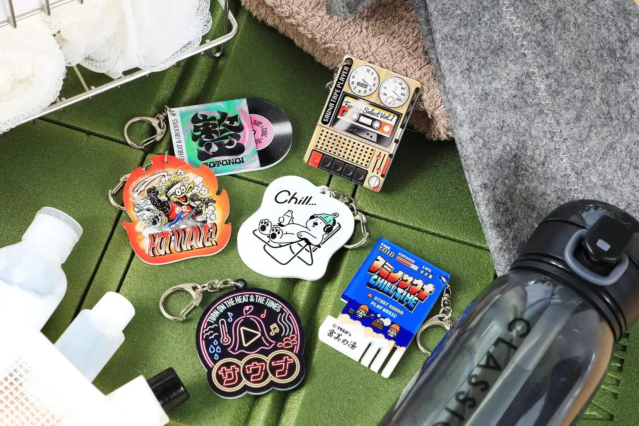 「サウナBGMアクリルキーホルダー」の無料貸出 6種類のアクリルキーホルダーから最大3個まで好みを選び、個室サウナに持ち込むことができます。各アクリルキーホルダーにはサウナにおすすめの音楽プレイリスト紹介ページを登録しています。お手持ちのスマートフォンをかざすだけで簡単にプレイリストを選択し、サウナ個室のBGMとして再生することができます。 |