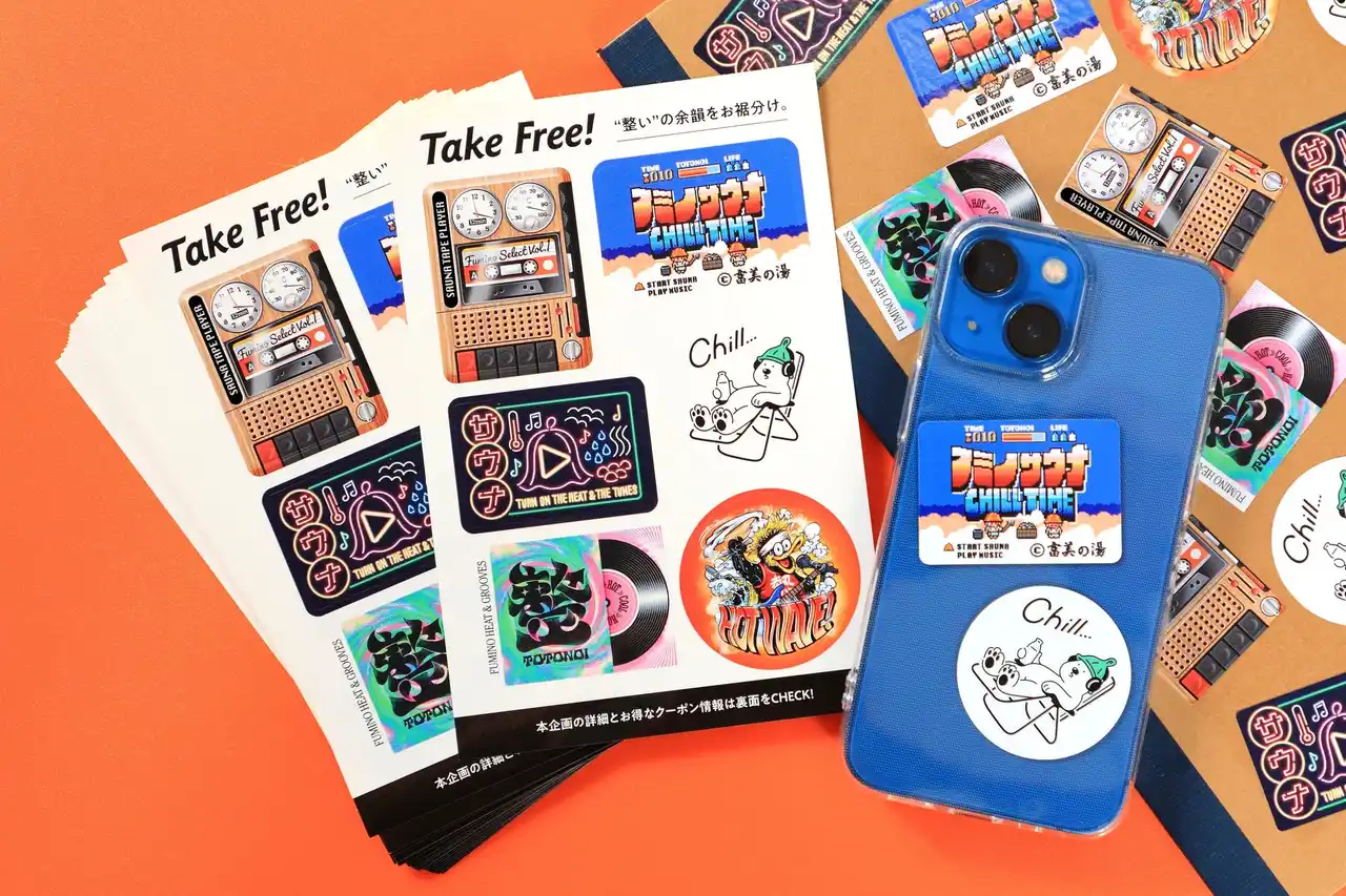 オリジナルコラボステッカープレゼント イベント開催期間中にフミノサウナを利用された方に、6種類のアクリルキーホルダーデザインがプリントされたオリジナルステッカーを配布いたします。サウナモチーフのデザインは、すべて本企画のためにサウナ好きデザイナーが描きおろしたオリジナルのものです。(ステッカーは数量限定のため予定枚数に達し次第配布終了となります) |