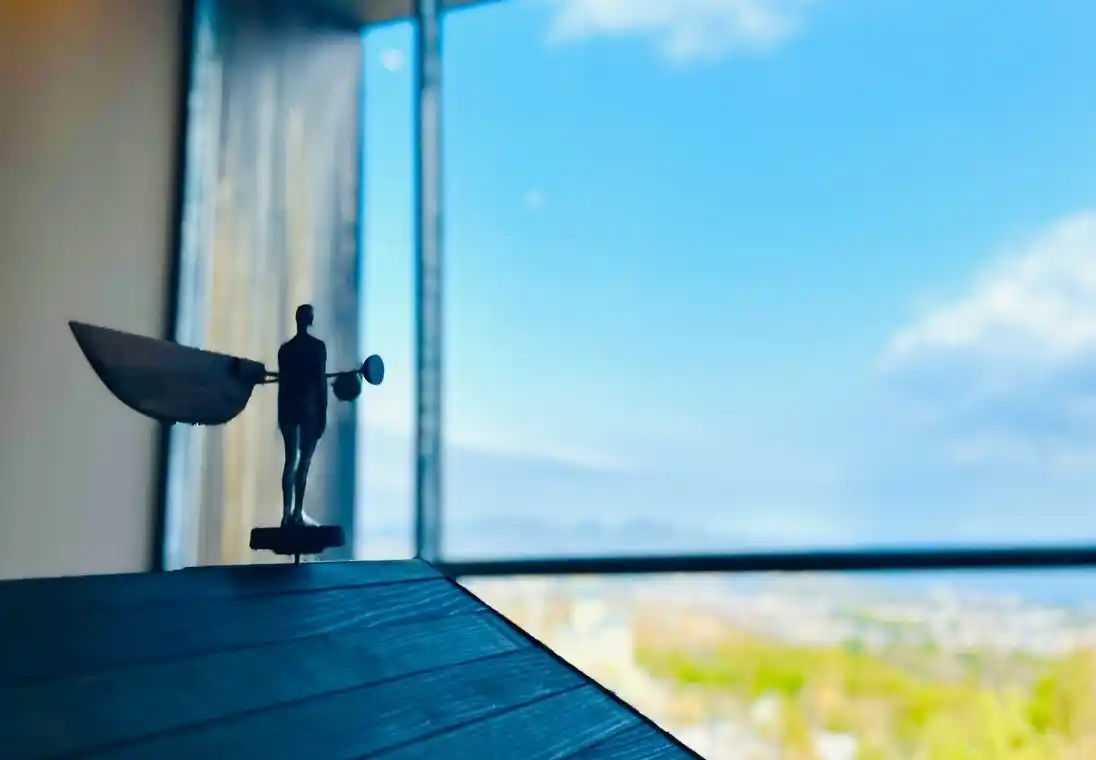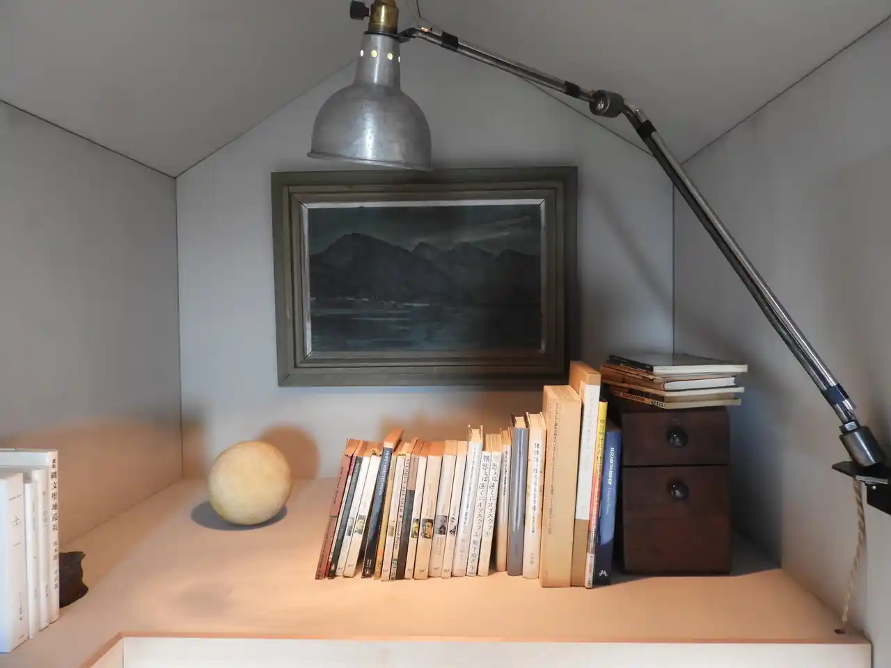「風見書架」と名付けられた小さな小屋には、海を見渡せる窓があり、本やアート作品が飾られています。屋根には風見鶏をモチーフにしたオブジェが置かれ、目の前に広がる世界を見つめています。小屋は自由に出入りでき、滞在中は読書や展示作品を鑑賞できます。小屋からの眺めもアート作品の一部となっています。このアート作品が、別府での滞在をより一層思い出深いものにしてくれることを願っています。 |