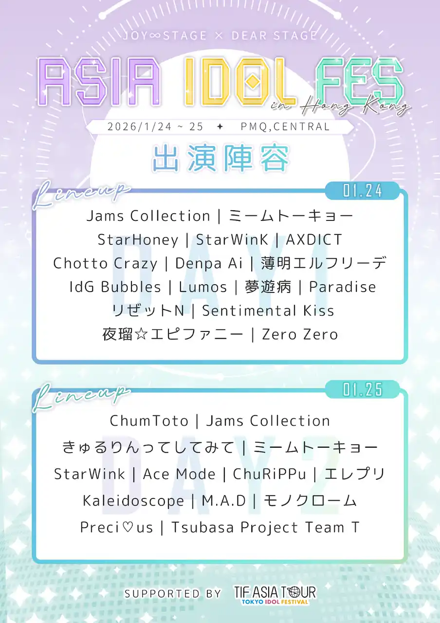 また本イベントは、世界最大級のアイドルフェス「TOKYO IDOL FESTIVAL」(以下、TIF)が、日本発の独自カルチャーである「アイドル」をアジアへ広く発信することを目的に、2021年より始動したプロジェクト『TIF ASIA TOUR』のサポートを受けて開催されます。 |