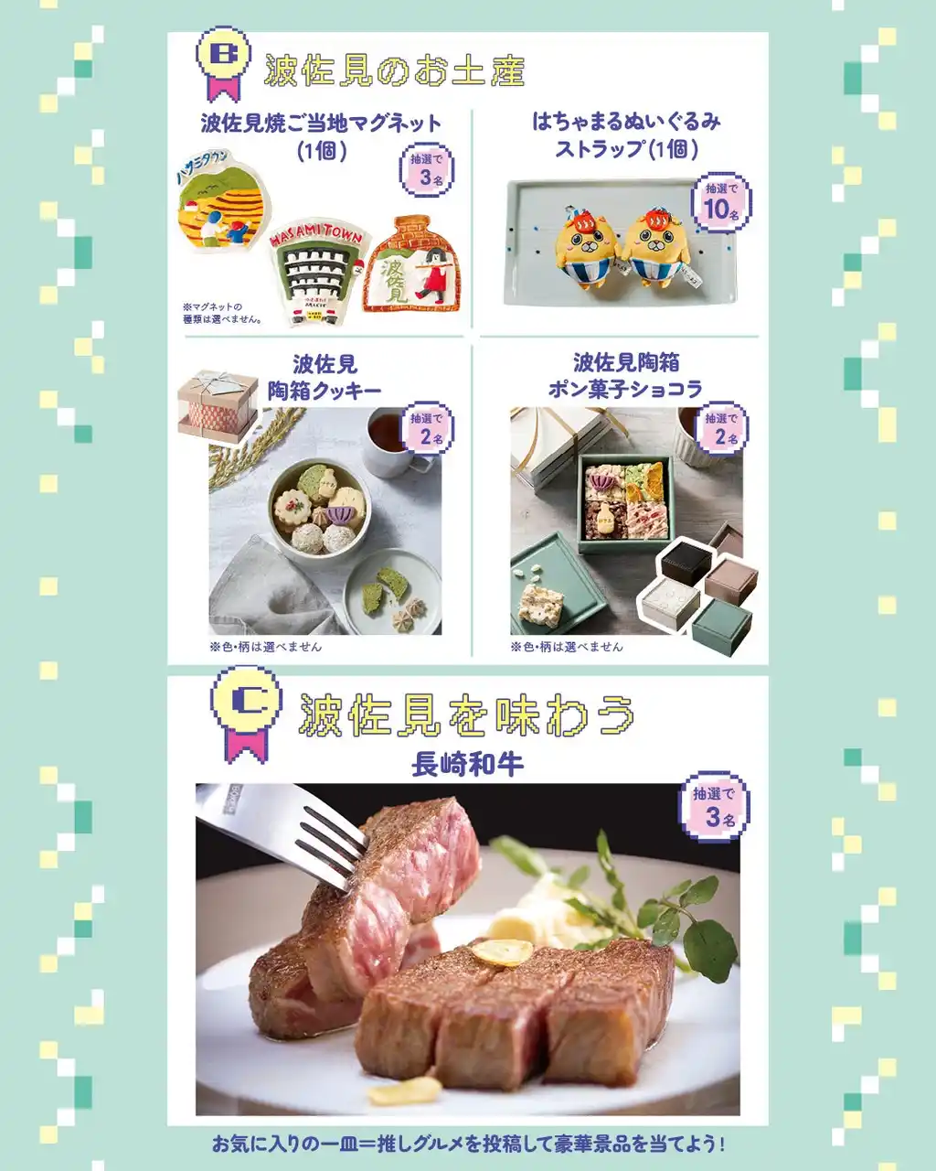 | さらに、ランチ写真の投稿やスタンプラリー応募で、波佐見での体験や波佐見焼、グルメセットなどなど豪華プレゼントが盛りだくさん。見て、食べて、買って、プレゼントをゲット! "波佐見推しグルメ [ランチ&スイーツフェア]"をお楽しみください。 | |||||||||||||||||||||