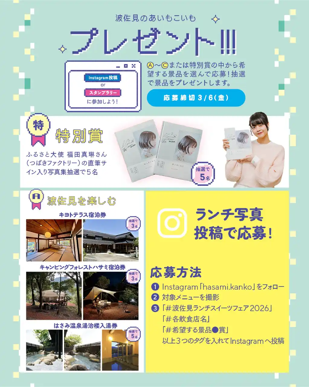 Instagramへの写真投稿で応募! 波佐見町観光協会のInstagram(@hasami.kanko)をフォロー後、対象メニューを撮影 「#波佐見ランチスイーツフェア2026」「#各飲食店名」「#希望する景品○賞」の3つのハッシュタグを付けて写真投稿で応募完了。 |