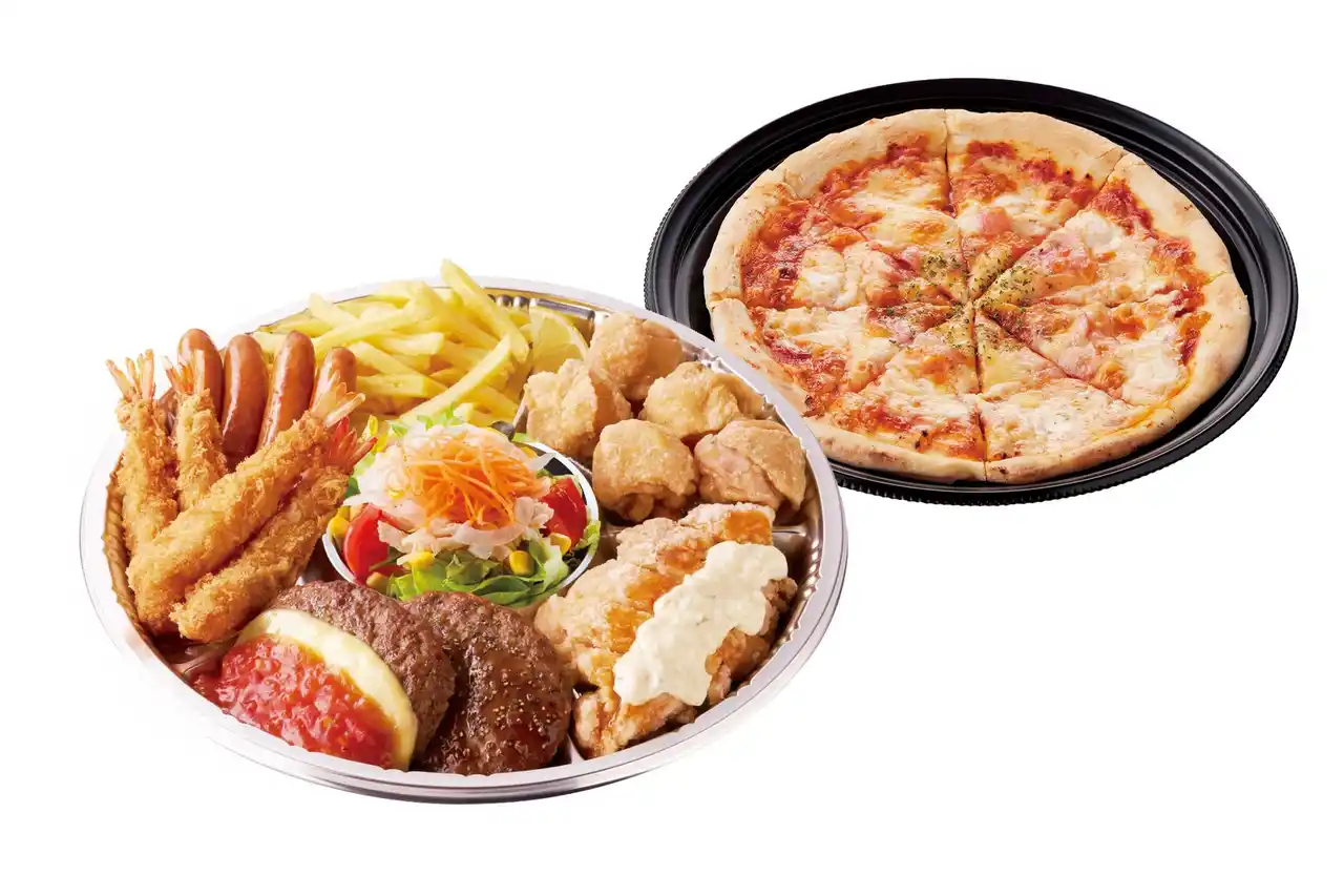 (ジョイフル塩唐揚げ・ツインハンバーグ・たっぷり3種チーズと旨みベーコンのクリーミーピザ・えびフライ・ソーセージ・チキン南蛮・サラダ・ポテトフライ(180g)) |