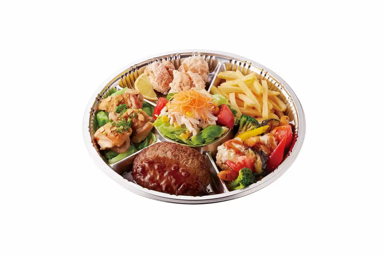 (ジョイフル塩唐揚げ、てりやきハンバーグ、ひとくちチキンステーキにんにく醤油、彩り野菜と若鶏の黒酢あんかけ、サラダ、ポテトフライ(90g)) |