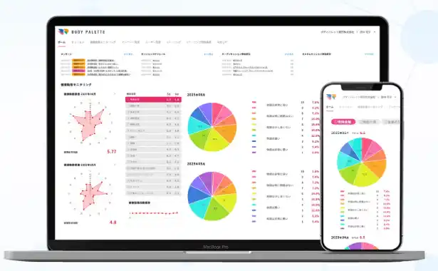 BODY PALETTEは、健康動態のモニタリングからオンライン運動、ログ管理、申請支援までを一体化することで、健康経営の「実行」と「証明」の両方を支えるプラットフォームです。 |