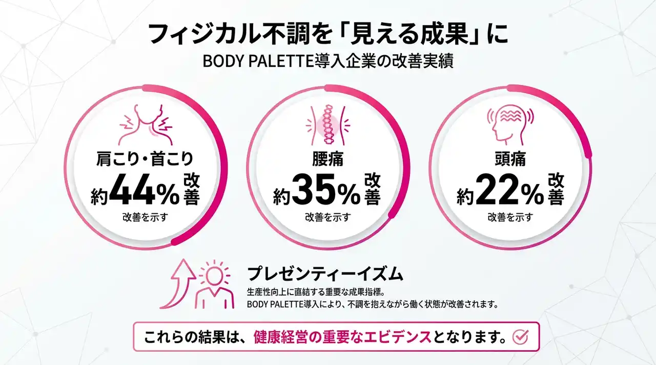 これらの数値は、プレゼンティーイズムの大きな要因であるフィジカル不調をどれだけ減らせるかという観点で、健康経営の成果を説明する際の重要なエビデンスとなります。 |