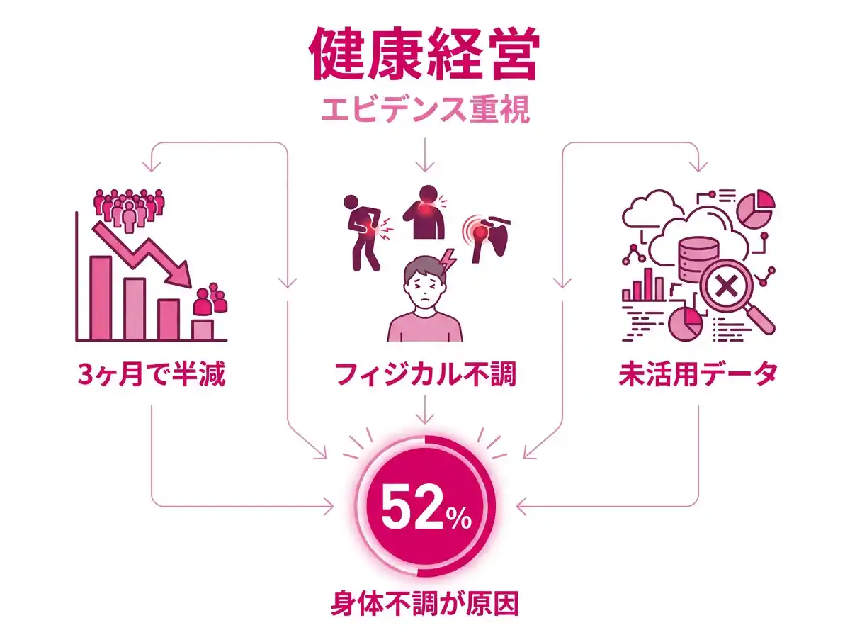 さらに、プレゼンティーイズム(健康の問題を抱えつつも出勤し仕事を行っている状態)による損失のうち、約52%がフィジカル領域に起因するとされており、「カラダの不調にどう向き合い、構造的に減らしていくか」 が、健康経営の中心テーマになりつつあります。 |