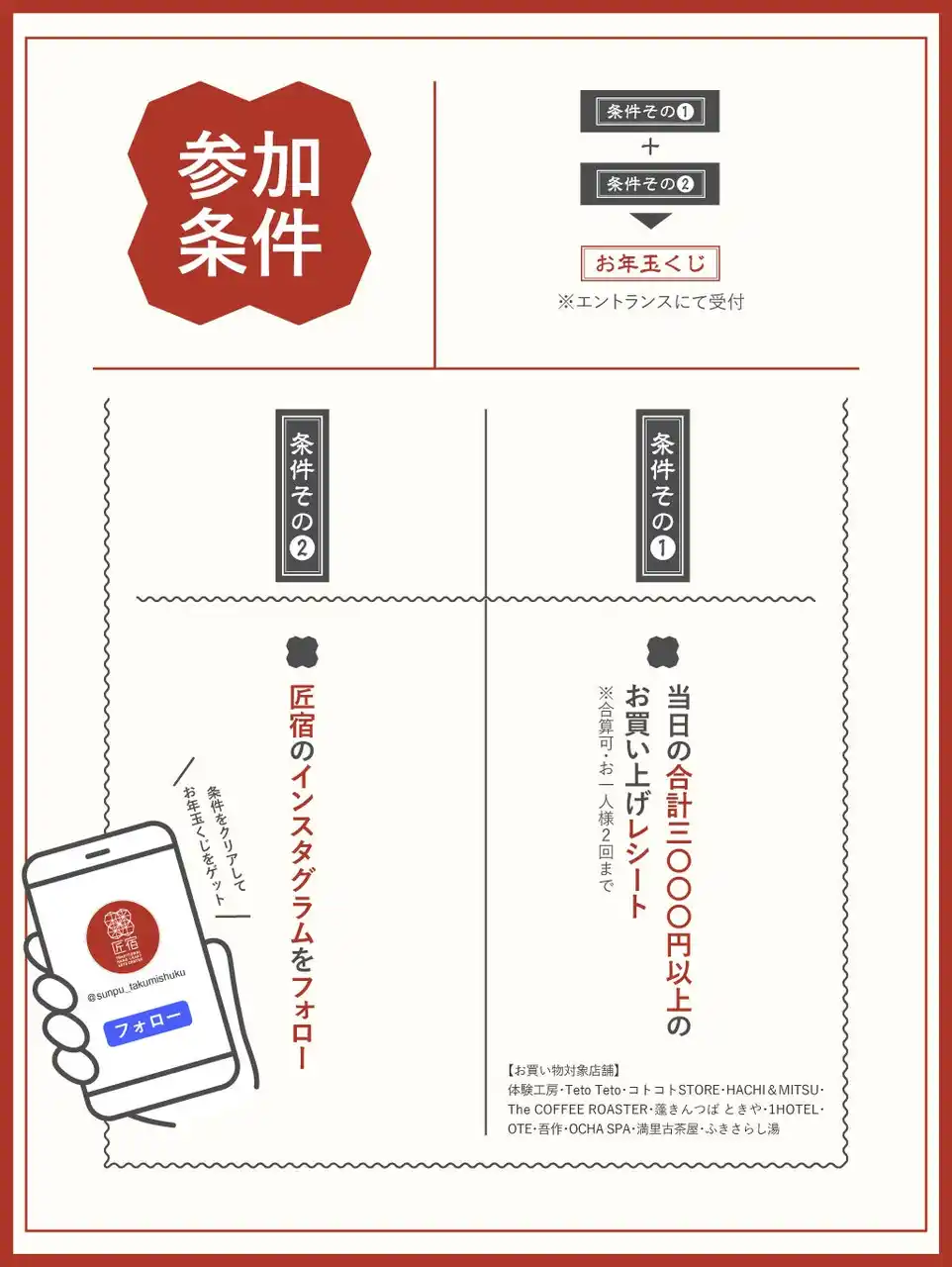 ※おひとりさま上限2回 抽選場所:匠宿内エントランス Hokore下 対象店舗:各体験工房/ギャラリーTetoTeto/コトコトSTORE/HACHI&MITSU/The COFFEE ROASTER /蓬きんつば ときや/ OCHASPA / 1HOTEL / 和食 OTE / 吾作/満里古茶屋/ふきさらし湯 |