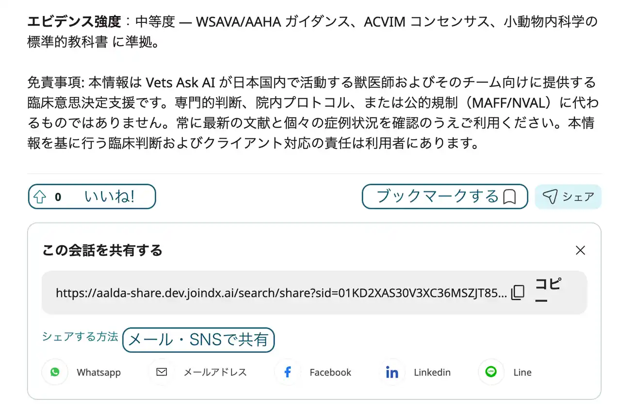 *”Vets Ask AI”は臨床判断を補助するものであり、これを代替するものではありません。また、匿名化された質問内容が教育コンテンツやフィード作成に活用されます。 |