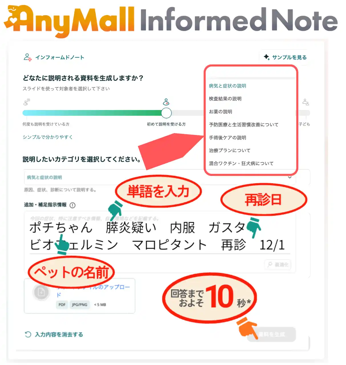 動物病院での説明内容をもとに、飼い主様がご自宅でも家族に説明でき、ホームケアを適切に実践できる説明資料を生成します。説明資料のレベルは、飼い主様の理解度に合わせて3段階で調整可能。
