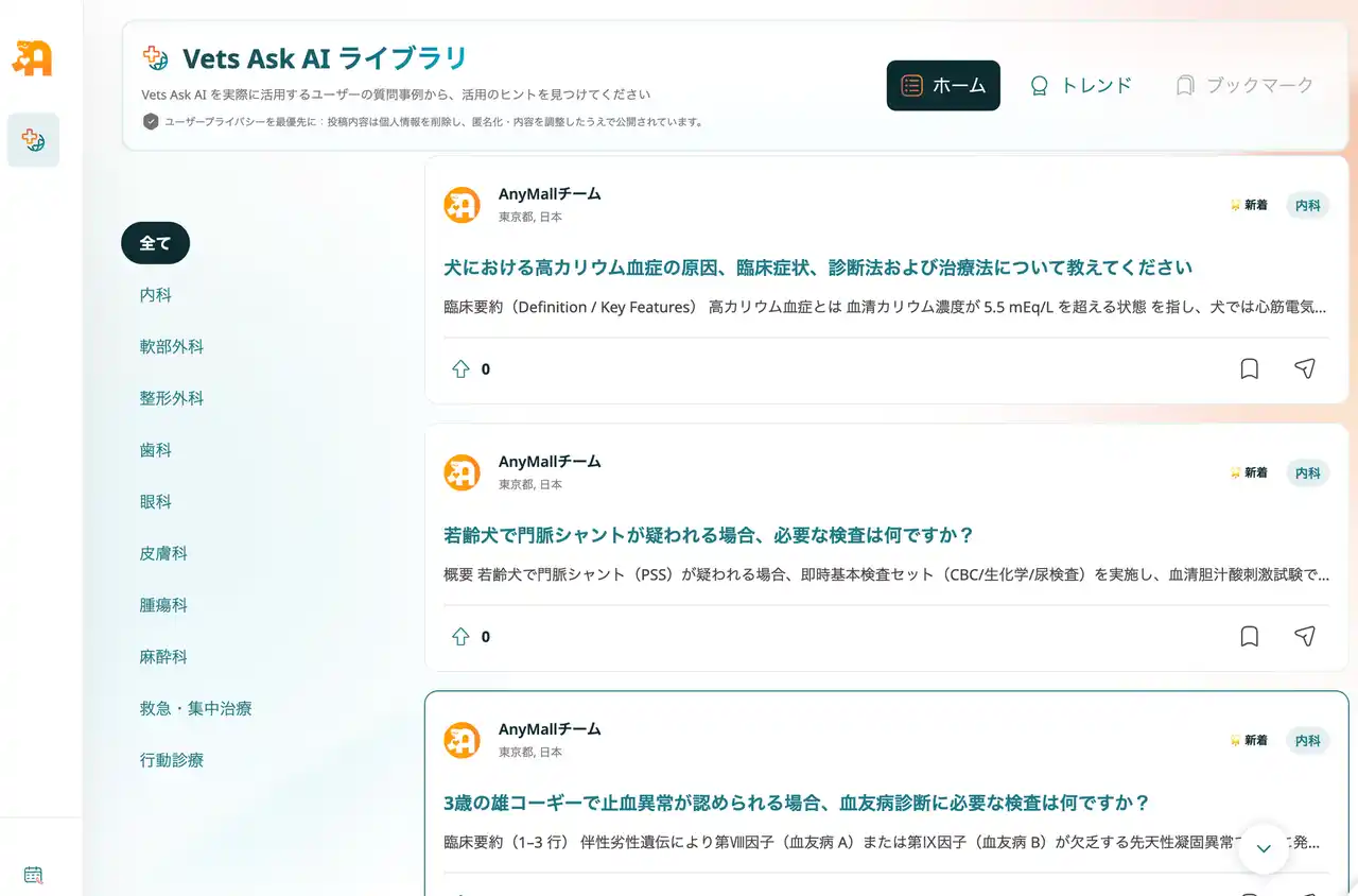 「Vets Ask AIライブラリ」は、獣医師・動物看護師たちが実際に「Vets Ask AI」へ投げかけた質問と、それに対するAI回答を閲覧できるストリーム(フィード)型ナレッジ共有機能です。 ユーザーの実体験に基づく質問に加え、質の高いナレッジを担保するため運営チームが厳選・作成した質問もあわせて掲載しています。 |
